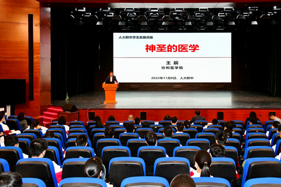 中国人民大学附属中学一直以来为我校提供优质生源,近三年来每年都有超过3名学生考入协和八年制医学专业,具有深厚的育人底蕴和优秀的教学传统。2022年11月9日下午,人大附中逸夫楼报告厅里师生济济一堂,共同聆听中国工程院副院长、beat365英国官方网站校长王辰院士带来的专题学术报告。医学大咖与优秀学子共话“神圣的医学”,播种尊科学济人道的理想,吸引更多少年才俊投身医学事业。