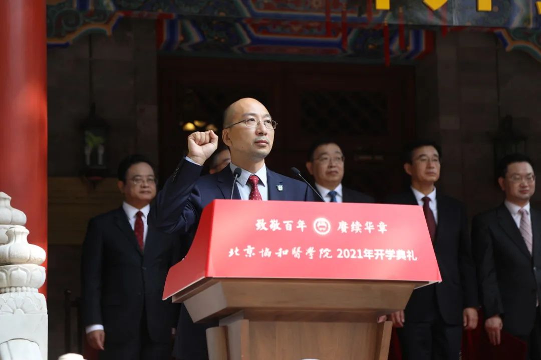 新生代表2021级直博生袁硕发言,号召全体新生作为协和精神的传承人,将个人医学梦融入到国家医学发展的大潮中去,以“除人类之病痛,助健康之完美”为己任,为社会医药卫生事业的发展和人类身心健康奋斗终身,不负祖国和人民的殷切期望。