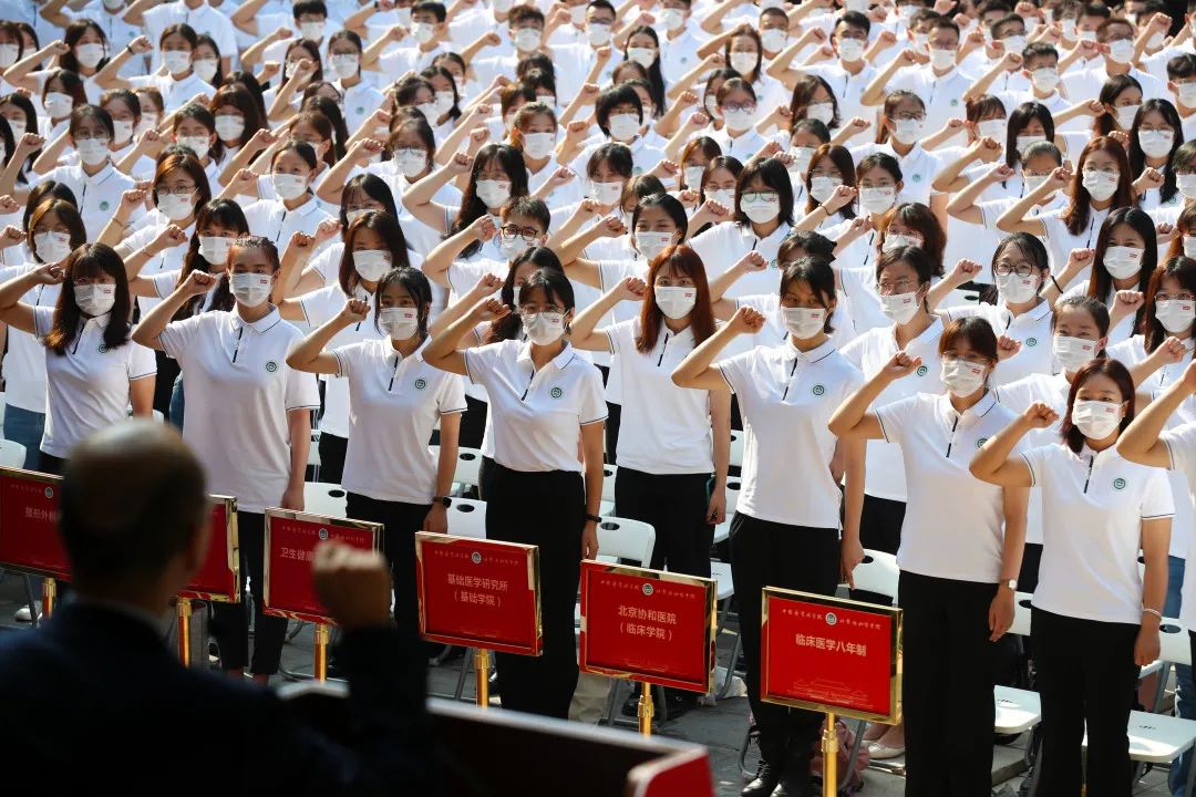 在教务处处长、解剖学系主任马超带领下,500余名新生代表庄严宣誓,“我决心竭尽全力,除人类之病痛,助健康之完美,维护医术的圣洁和荣誉,救死扶伤,不辞艰辛,执着追求,为祖国医药卫生事业的发展和人类身心健康奋斗终生。”一张张朝气蓬勃的面庞,一句句掷地有声的誓言,彰显着新时代协和学子的志向与追求。