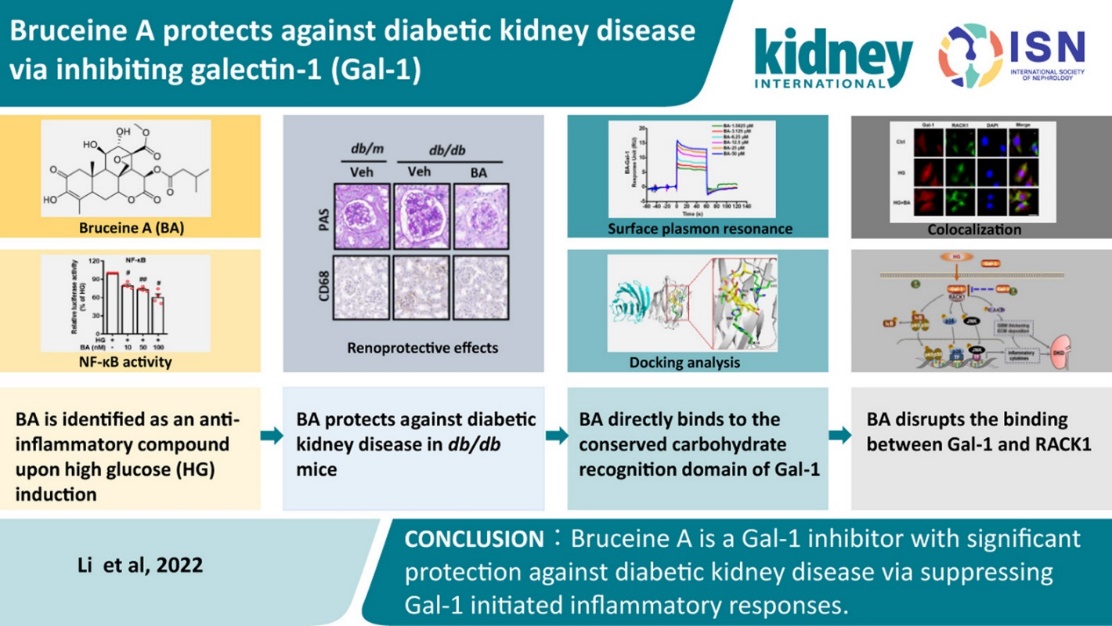 2022年5月19日,beat365英国官方网站医药生物技术研究所王真团队在肾脏病研究领域权威杂志Kidney International在线发表了题为“Bruceine A protects against diabetic kidney disease via inhibiting galectin-1”的研究论文。该研究发现提取自中药鸦胆子的苦木素类单体鸦胆子素A具有良好的体外抗炎作用及体内抗炎和抗糖尿病肾病的保护作用。