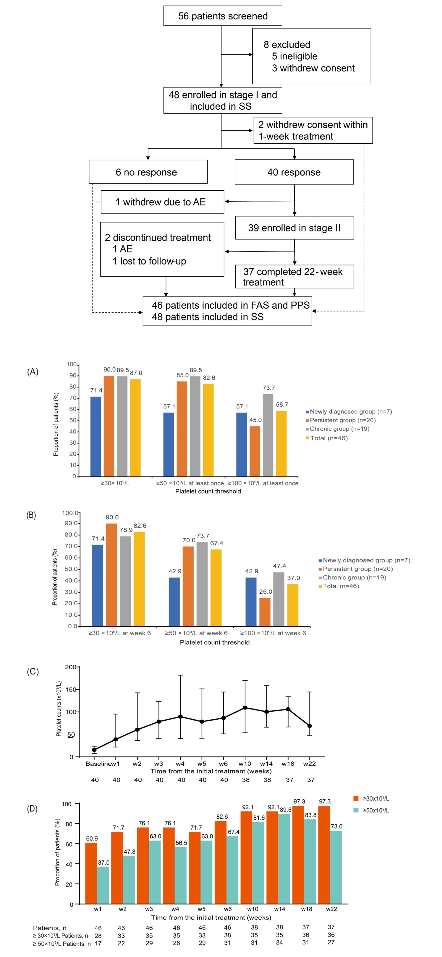 该研究前瞻性纳入了2018年至2021年全国六个中心共48名ITP-HBV患者,其中46例患者完成研究第一阶段,37例患者完成了第一及第二阶段共22周的研究,主要研究终点为艾曲泊帕治疗6周后血小板计数≥50×109/L的患者比例。结果显示,67.4%的患者达到研究主要终点,中位应答时间为8天。至研究结束时,87.0%的患者在22周的治疗期内至少一次血小板计数≥50×109/L。通过亚组分析显示新诊断、持续性及慢性ITP-HBV组均能获得稳定、快速的血小板计数提升。最常见的不良事件是肝功能异常,大部分患者可自行恢复正常或经保肝治疗后缓解,有1例受试者因肝功能异常合并血栓发生退出研究。该研究表明,艾曲泊帕对ITP-HBV患者治疗有效,不良反应可耐受,为ITP-HBV患者的治疗提供了高质量的循证医学依据。
