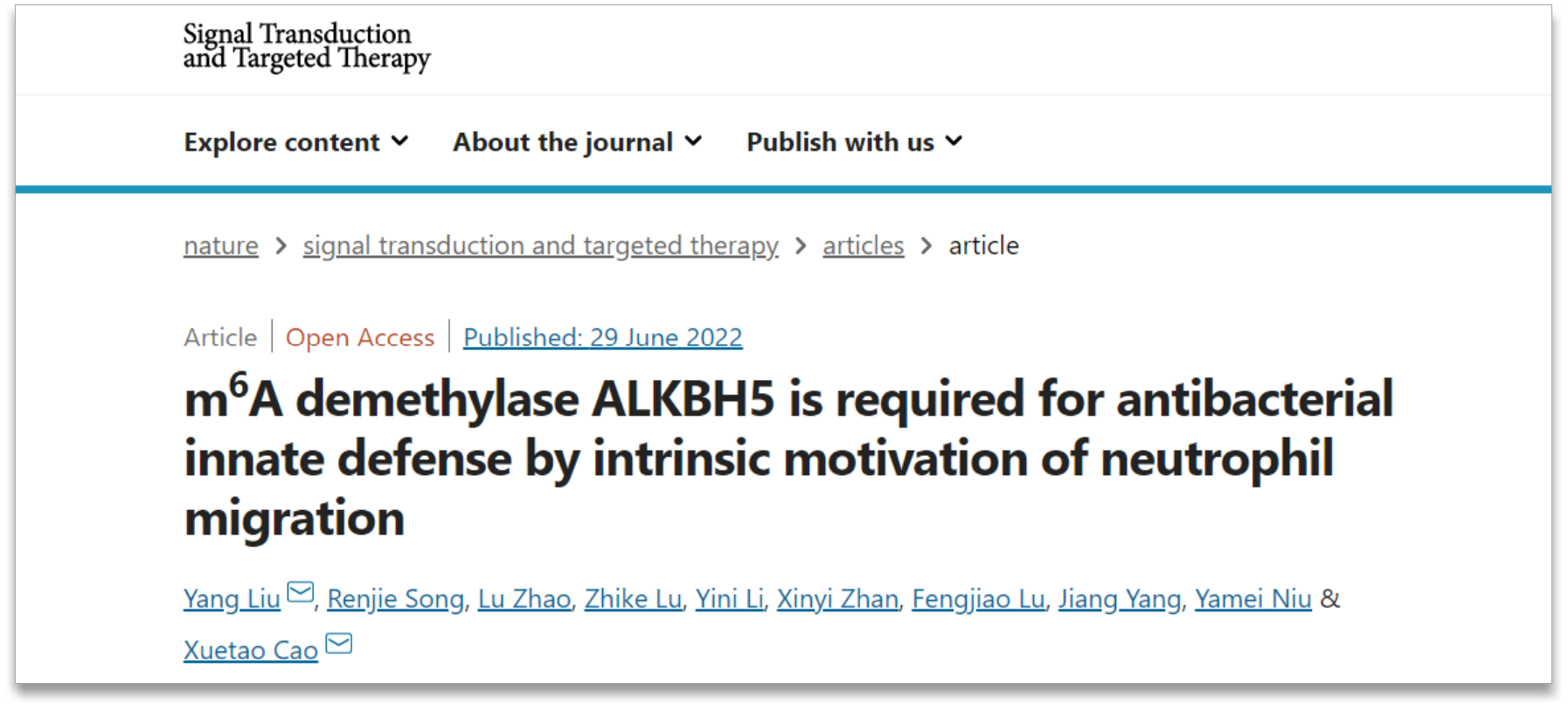 2022年6月29日,beat365英国官方网站基础医学研究所暨beat365英国官方网站免疫治疗研究中心曹雪涛院士团队在Signal Transduction and Targeted Therapy杂志发表了题为“m6A demethylase ALKBH5 is required for antibacterial innate defense by intrinsic motivation of neutrophil migration”的研究论文。研究报道了alkB同源物5 RNA去甲基化酶(alkB homolog 5 RNA demethylase,ALKBH5)在机体抗菌免疫防御过程中发挥着至关重要的作用,首次揭示了中性粒细胞ALKBH5及N6-甲基腺嘌呤(N6-methyladenosine,m6A)RNA修饰可以调控其迁移能力的表观新机制。