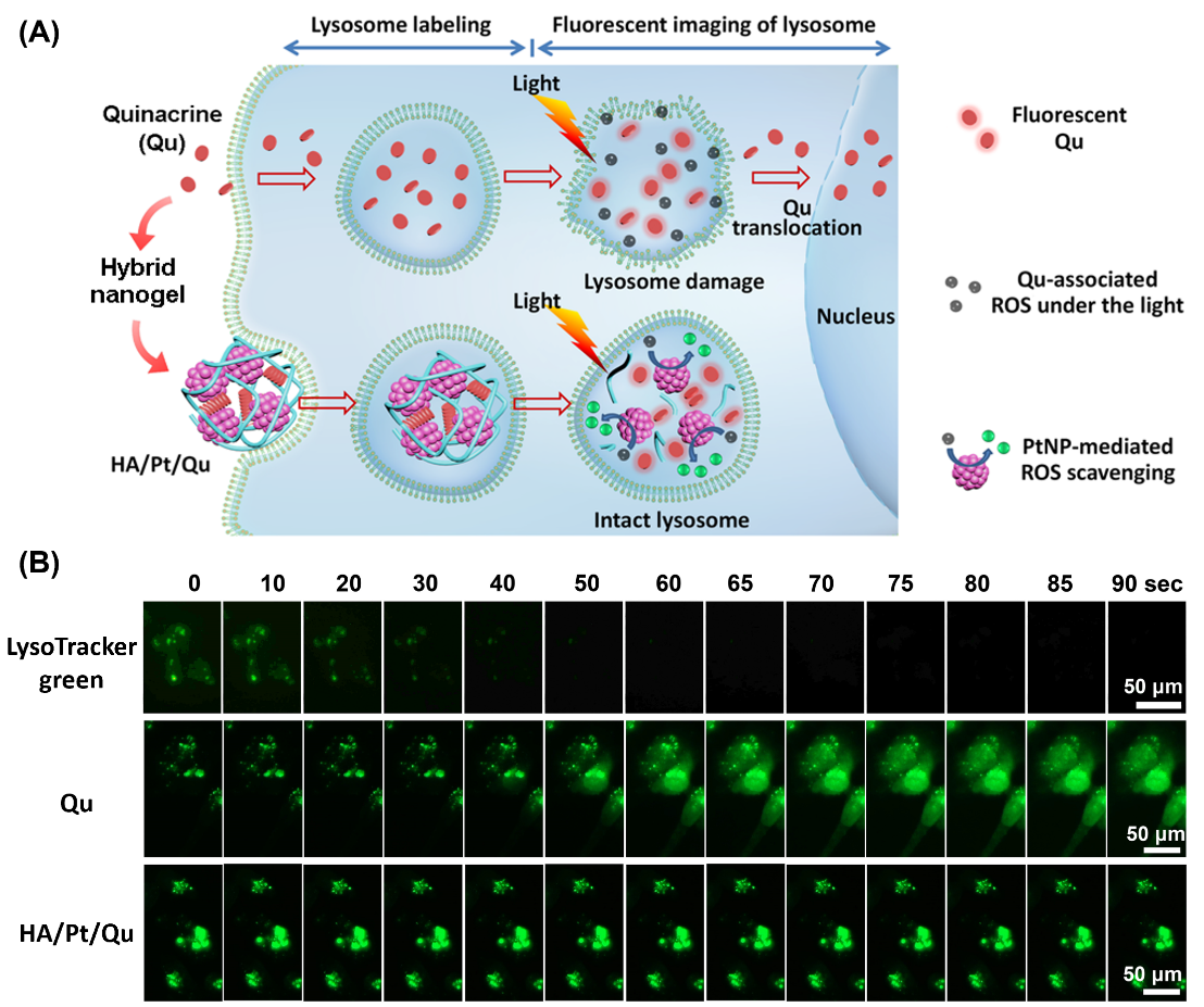 为了克服活细胞荧光成像过程中的光毒性,该研究发展了一种同时包含铂纳米颗粒(PtNP)和荧光染料阿的平(Quinacrine,Qu)的复合纳米凝胶(HA/Pt/Qu)。在该纳米凝胶标记细胞溶酶体后,利用其包含的PtNP的类超氧化物歧化酶(SOD)特性,在原位去除光激发Qu产生的ROS,成功实现了荧光成像过程中光毒性的主动去除(图1)。