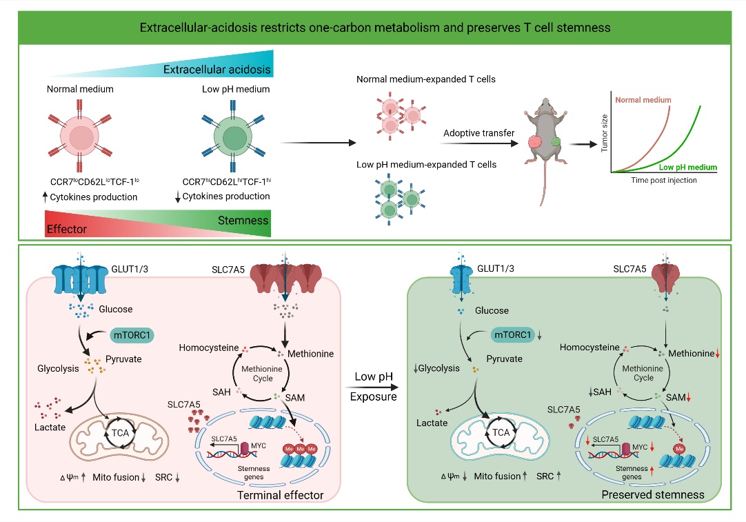 2023年1月30日,beat365英国官方网站系统医学研究院/苏州系统医学研究所(简称“系统院”)李贵登、张连军团队与四川大学华西第二医院陈路团队合作在Nature Metabolism《自然-代谢》在线发表题为“Extracellular acidosis restricts one-carbon metabolism and preserves T cell stemness”(胞外酸度抑制一碳代谢维持T细胞的干性)的研究论文。该研究发现,长期胞外酸处理T细胞可抑制MYC-SLC7A5轴,阻碍T细胞内甲硫氨酸的摄入,进而重编程T细胞内的一碳代谢及表观遗传图谱,促进线粒体代谢适应性,最终维持干性T细胞状态。