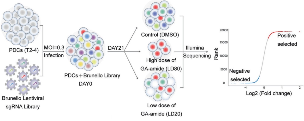 本研究发现GA-amide能穿透血脑屏障,在脑肿瘤区富集,显著地抑制神经胶质瘤生长。通过sgRNA慢病毒文库对GA-amide在患者来源的原代胶质瘤细胞(PDCs)中的功能靶基因进行全基因组范围的筛选和鉴定,最终证明了GA-amide与靶蛋白WDR1结合后,促进WDR1、MYH9和Cofilin复合物的形成,加速了F-肌动蛋白的解聚以减弱PDCs的侵袭能力,并通过线粒体途径诱导PDCs凋亡。该研究揭示了GA-amide在神经胶质瘤中的新靶点和调控细胞骨架稳态的信号转导机制,为胶质瘤的临床治疗提供了新的干预策略。(图1)