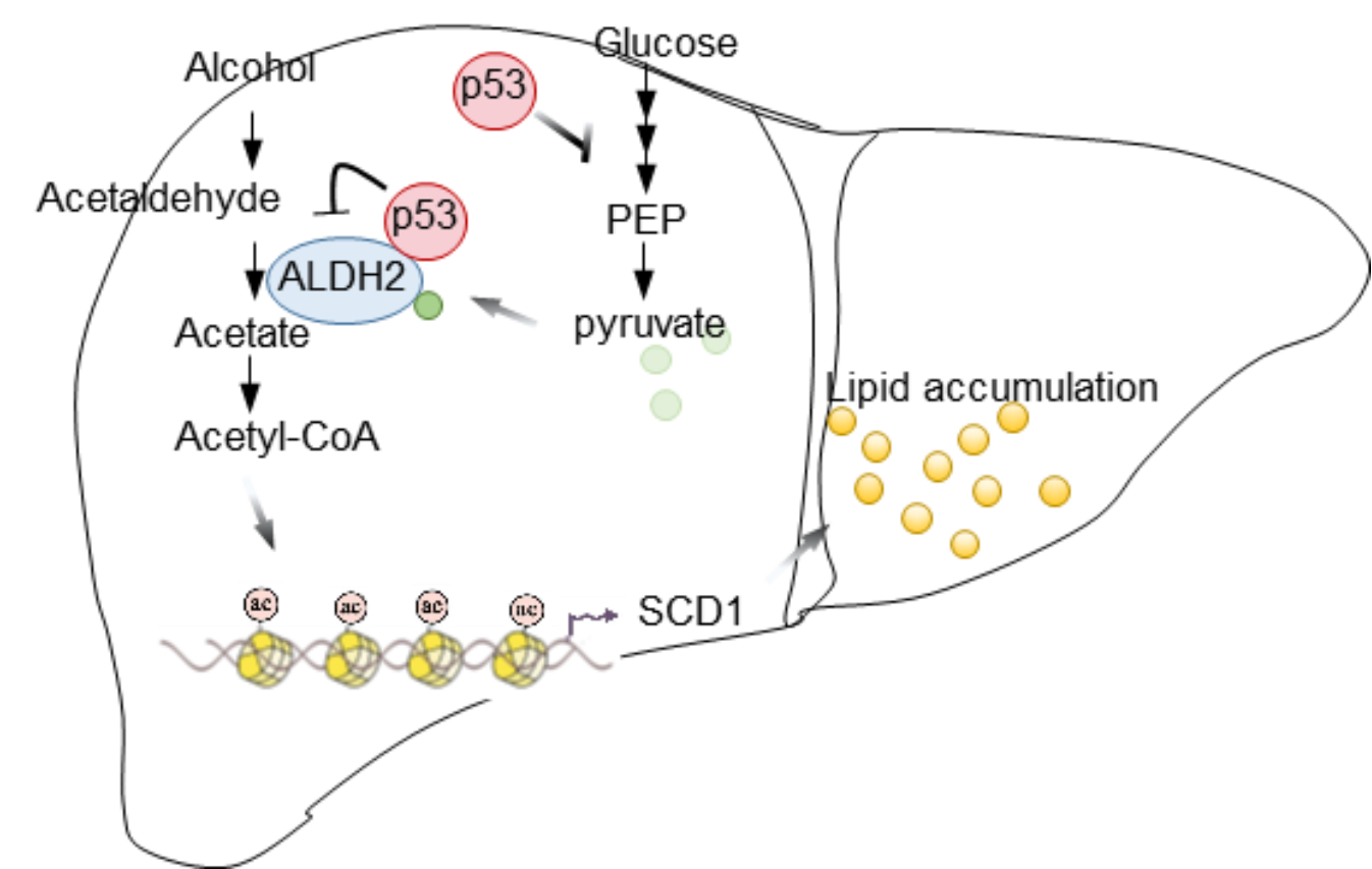 该团队研究发现p53直接结合并抑制乙醛脱氢酶2(ALDH2),ALDH2是负责酒精氧化的一个关键酶,催化乙醛形成醋酸。通过抑制酒精氧化,p53降低了细胞内乙酰CoA水平和组蛋白乙酰化水平,从而抑制硬脂酰CoA脱饱和酶-1(SCD1)基因的表达。从机制上讲,p53直接与ALDH2结合,阻止其活性四聚体的形成,导致ALDH2酶活性的降低;此外,研究人员还发现丙酮酸也可以直接结合并激活ALDH2。值得注意的是,研究人员在通过酒精喂养建立的小鼠模型中发现,p53缺失的小鼠表现出脂质积累的增加,而敲除ALDH2则逆转了该现象。此外,肝脏特异性敲除SCD1可以缓解p53缺失引起的酒精诱导的肝脏脂肪变性。相反,SCD1在肝脏中的过量表达会促进酒精诱导的野生型小鼠脂肪肝的发展,而对p53或ALDH2基因敲除小鼠的影响较小。
