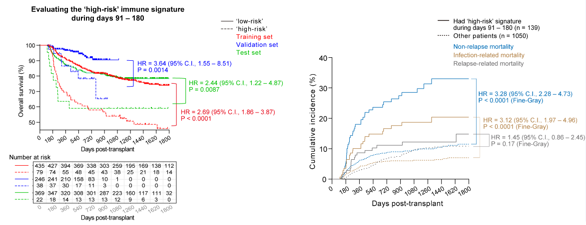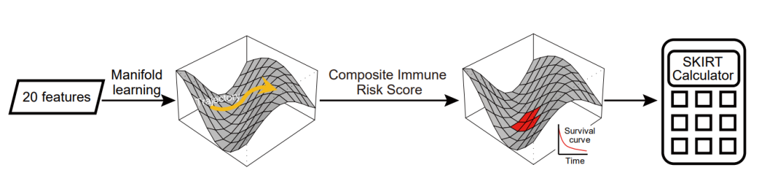 通过生存分析联合Grid-Search优化策略,经交叉验证发现移植后91–180天的免疫学特征可以预测异基因移植患者生存。为了寻找一个与“体质指数BMI”一样简单的计算方法,该研究通过整合八个关键免疫学指标,提出了易于临床使用的综合免疫风险评分(Composite Immune Risk Score, CIRS)来预测患者造血干细胞移植后的生存情况。CIRS在训练集可以很好地预测全因死亡(HR = 2.69, P < 0.0001),并在独立的验证集(HR = 3.64, P = 0.0014)及外部测试集(HR = 2.44, P = 0.0087)得到证实。研究团队还开发了可公开访问的网络工具— SKIRT计算器(https://skirt-calculator.shinyapps.io/skirt-calculator/),帮助临床医生评估患者移植后免疫重塑进展。