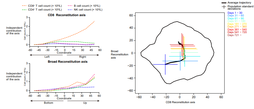 研究发现,移植后的前两个月细胞数量恢复以CD8+ T细胞为主,随后NK细胞、CD8+T细胞、CD4+T细胞和B细胞广泛恢复,免疫重塑个体异质性在移植后约60天达到最大。