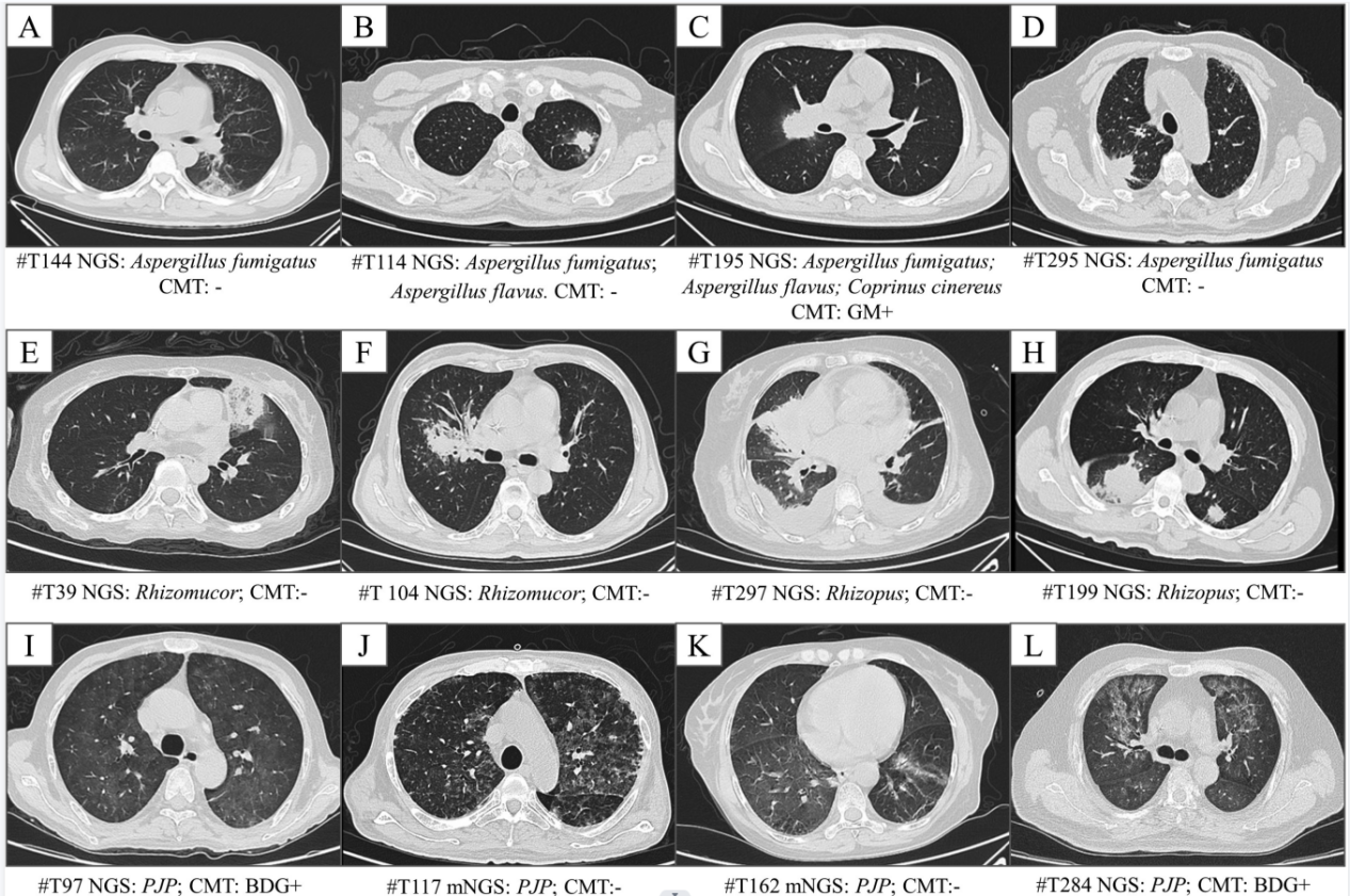 随后,研究者对血液样本病原mNGS检测在疑似肺部真菌感染患者中的诊断价值进行分析。结果显示,曲霉、毛霉、肺孢子菌这三种血液病患者肺部感染最常见的真菌病原,检出率分别为14.2%、8.1%和5.0%。其中粒缺患者曲霉检出率高于非粒缺患者,检出曲霉的23名患者中,传统微生物学检测仅检出10名患者。对检出真菌的46名患者,临床医生对其半数以上进行了药物调整,优化了抗真菌感染治疗策略。