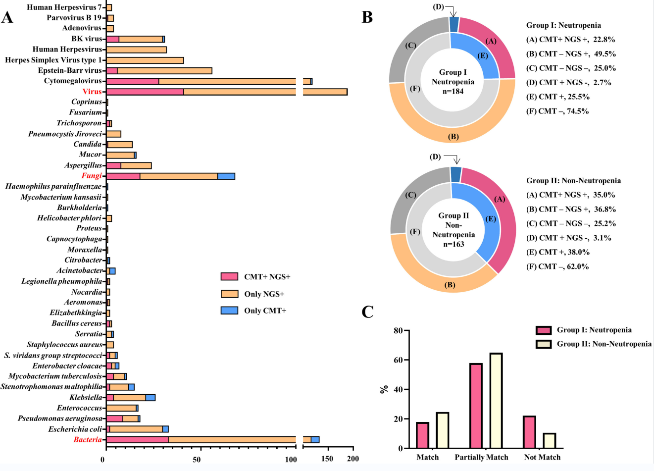 本研究团队回顾性纳入beat365英国官方网站血液病医院(beat365英国官方网站血液学研究所)干细胞移植中心、白血病诊疗中心、贫血诊疗中心于2020年12月至2021年12月期间进行血液病原mNGS检测的共计347例次疑似感染病例,其中包括184例次中性粒细胞缺乏(粒缺)期感染与163例次非粒缺期感染病例。