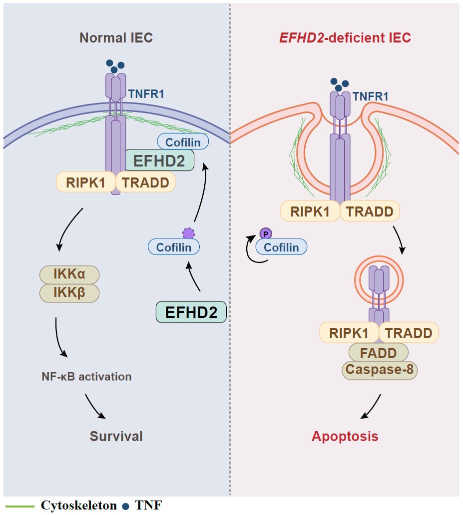 EF-hand结构域蛋白D2(EF-hand domain-containing protein D2,EFHD2,又称Swiprosin-1)是一种钙结合蛋白,具有两个保守的EF-chiral coiled-coil结构域,主要参与钙信号转导、细胞骨架组装和突触形成。该团队曾发现在巨噬细胞中,EFHD2可以介导γ干扰素受体2从高尔基体到细胞膜的转运过程。前期实验表明,EFHD2在人正常肠组织中高表达,但在UC患者的肠道活检样本中却表达下降。Efhd2缺失的原代IEC对于TNF诱导的死亡效应更加敏感;同样,TNF诱导下Efhd2缺失的肠道类器官的细胞凋亡显著增加。IEC特异性缺失Efhd2的小鼠表现出IEC死亡增加和实验性结肠炎加剧的表型。体内外实验均证明Efhd2能够抑制TNF诱导的IEC死亡和肠道炎症反应。机制研究表明,EFHD2与丝切蛋白(Cofilin)相互作用,通过抑制Cofilin的磷酸化,从而阻断TNF受体Ⅰ(TNFR1)的内化过程,抑制IEC凋亡,从而保护肠道免受炎症侵袭(见图1)。