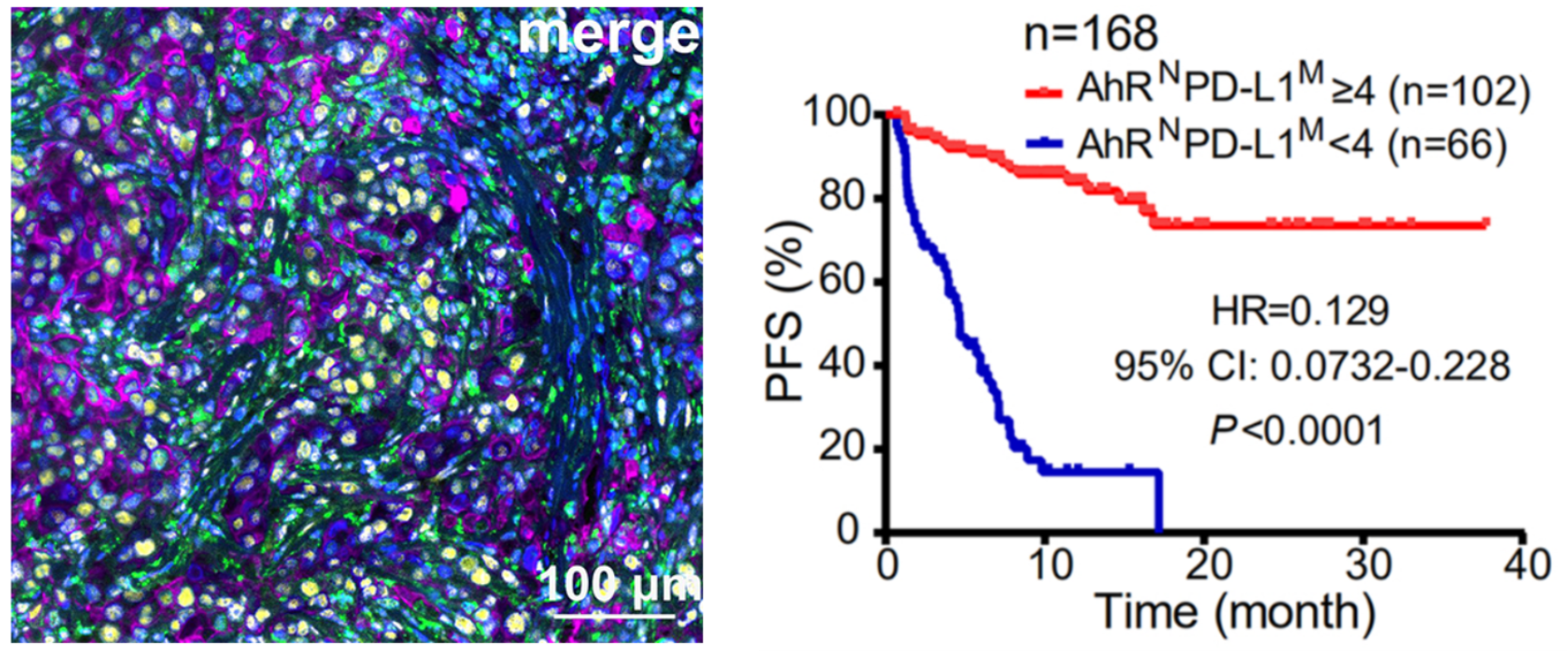 以PD-1、PD-L1抗体为代表的免疫治疗药物,是癌症研究的重大成果,显著改善了部分(20%-30%)病人的预后。在病人接受免疫治疗时,利用免疫组化方法检测病人癌组织中PD-L1的表达水平,是最常用的疗效预测方法。但是,有相当部分病人PD-L1表达量高但对治疗反应差,而部分病人PD-L1表达水平低但疗效却好。因此,更精准的疗效预测指标是肿瘤免疫疗法的迫切需求。周光飚研究团队前期研究发现,AhR在烟霾致癌物苯并吡作用下,上调PD-L1的表达使肿瘤细胞得以逃避免疫细胞的杀伤作用(https://doi.org/10.1038/s41467-019-08887-7)。