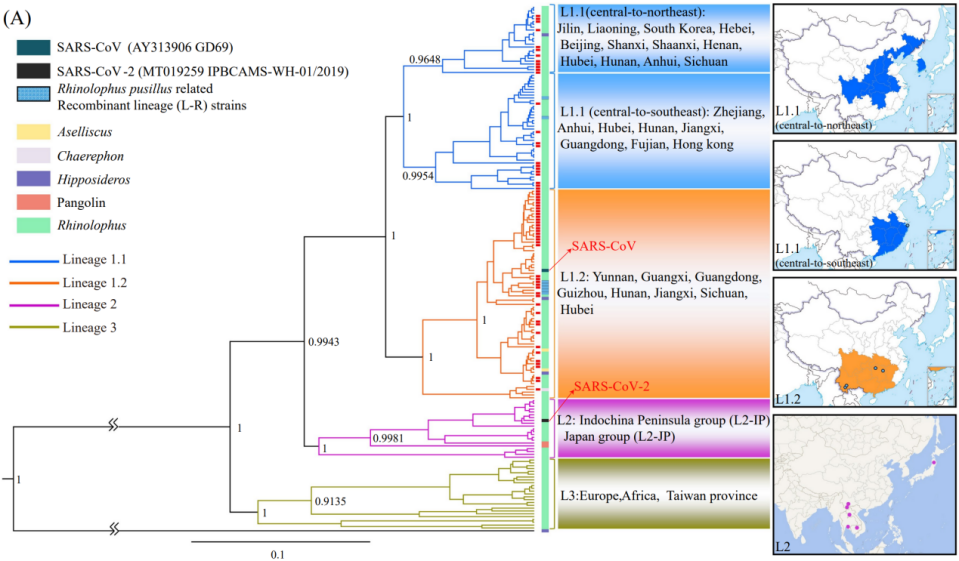 图2. 蝙蝠Sarbecovirus亚属冠状病毒分布及系统分化图