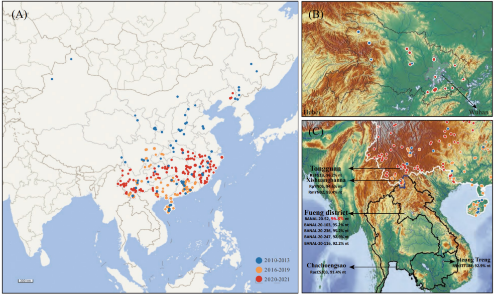 本文指出,我国境内菊头蝠种群中SARS-CoV-2相关冠状病毒(SC2r-CoV)的循环非常有限,需要在现有边境采样点的更南部和东南亚地区开展研究,来探索与SARS-CoV和SARS-CoV-2关联性更高的动物冠状病毒多样性,进一步寻找其直接祖先。同时,应该进一步加强蝙蝠携带重组冠状病毒的监测,来预警未来新发传染病的发生。目前国际权威机构发现中南半岛地区蝙蝠携带与SARS-CoV-2同源性更高的SC2r-CoV(Temmam et al. Nature. 2022),这个结果验证了本研究的结论和推测。