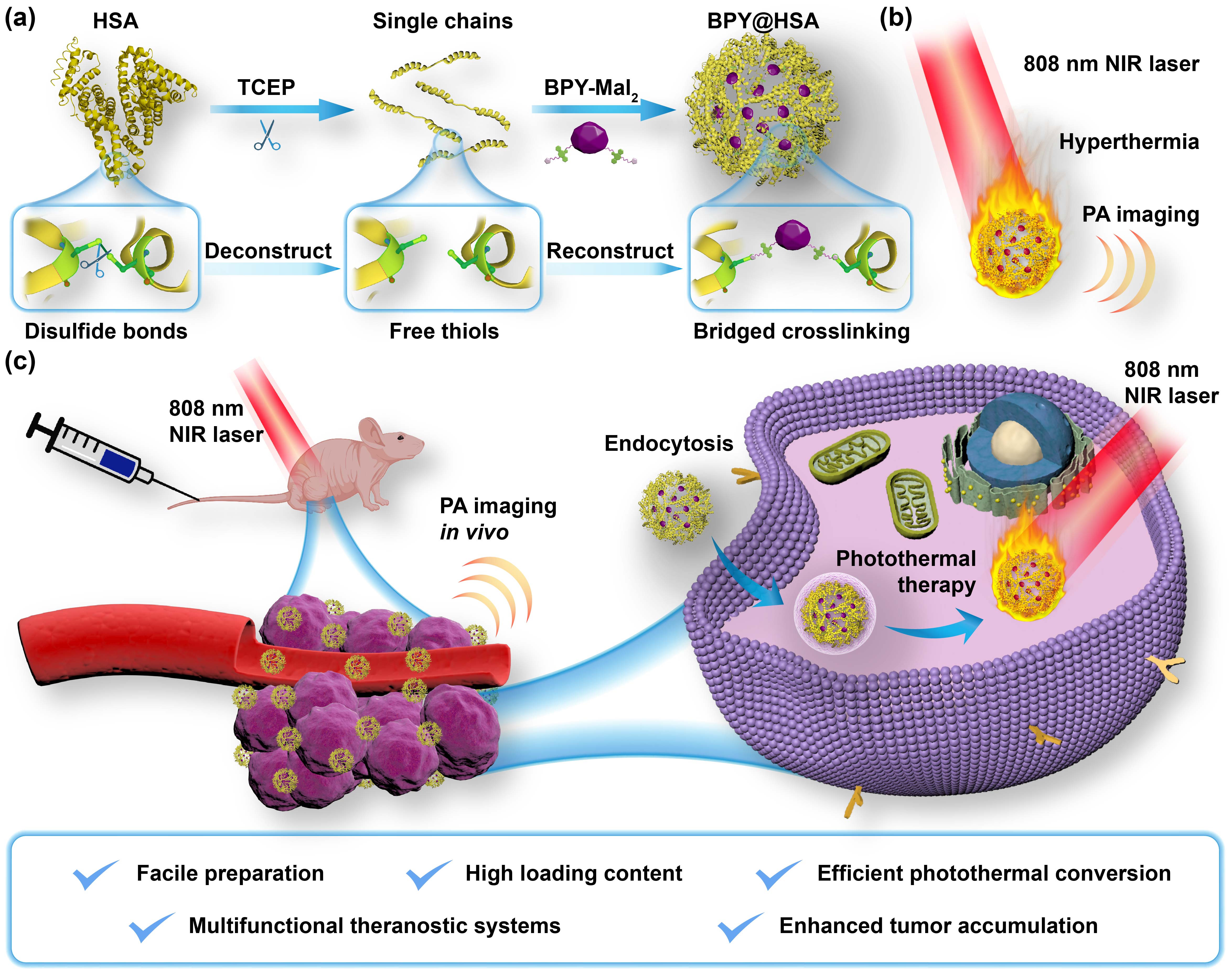 2023年10月17日,beat365英国官方网站生物医学工程研究所梅林团队与中山大学陈洪中团队、南洋理工大学赵彦利团队合作在Nature Communications 《自然通讯》发表了题为“NIR-dye bridged human serum albumin reassemblies for effective photothermal therapy of tumor”(NIR染料桥接人血清白蛋白自组装纳米粒用于肿瘤的高效光热治疗)的论文。该研究开发了一种新型人血清白蛋白(HSA)药物递送体系,用于高效负载具有双马来酰亚胺结构的近红外(NIR)染料,实现了抗肿瘤药物的主动靶向递送和肿瘤的高效光热治疗。