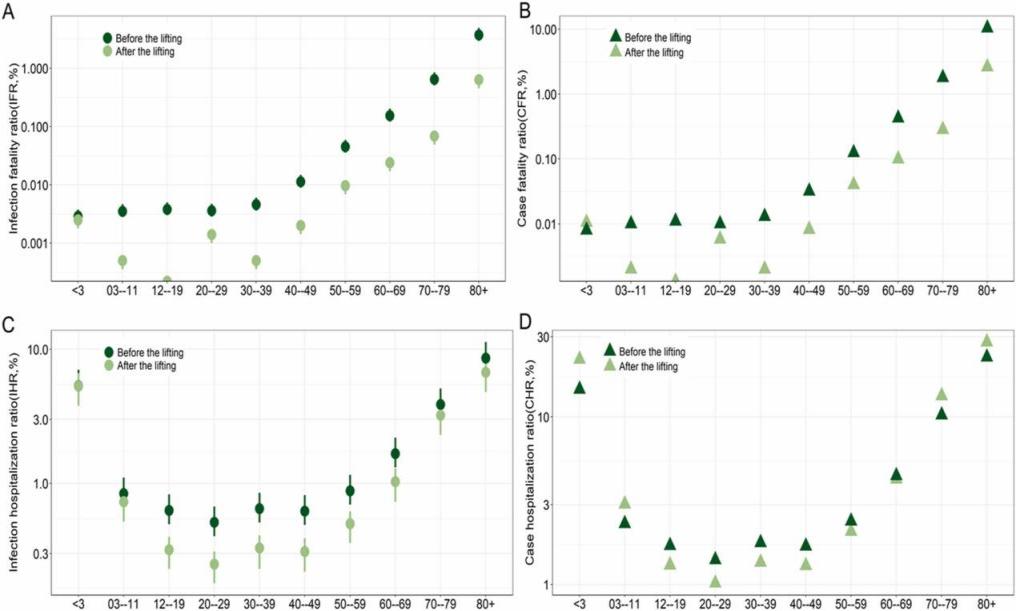 图1.放松隔离和核酸检测措施前后年龄别病死率和住院率