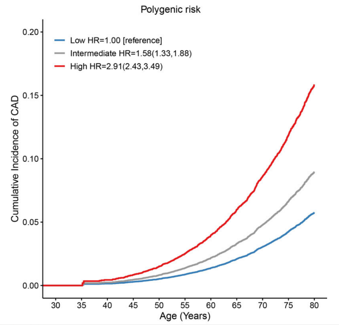 本研究整合了中国、日本、韩国、新加坡等26万东亚人群冠心病基因组数据,鉴定了影响中国和东亚人群冠心病及主要危险因素的540个遗传变异和作用强度,构建了适合我国和其他东亚人群的冠心病多基因风险评分系统,并在我国前瞻性随访20年的4万多人群队列中评价和验证了其对冠心病的预测价值。研究发现,该冠心病多基因风险评分系统能够有效预测冠心病发病风险,描绘个体随年龄增长的发病轨迹(图1)。高遗传风险者(评分最高的20%)发生冠心病的风险是低遗传风险者(评分最低的20%)的近3倍,两组人群冠心病终生发病风险(到80岁时)分别达15.9%和5.8%。如果高遗传风险者同时伴有冠心病家族史,那么冠心病终生发病风险将高达27.7%。