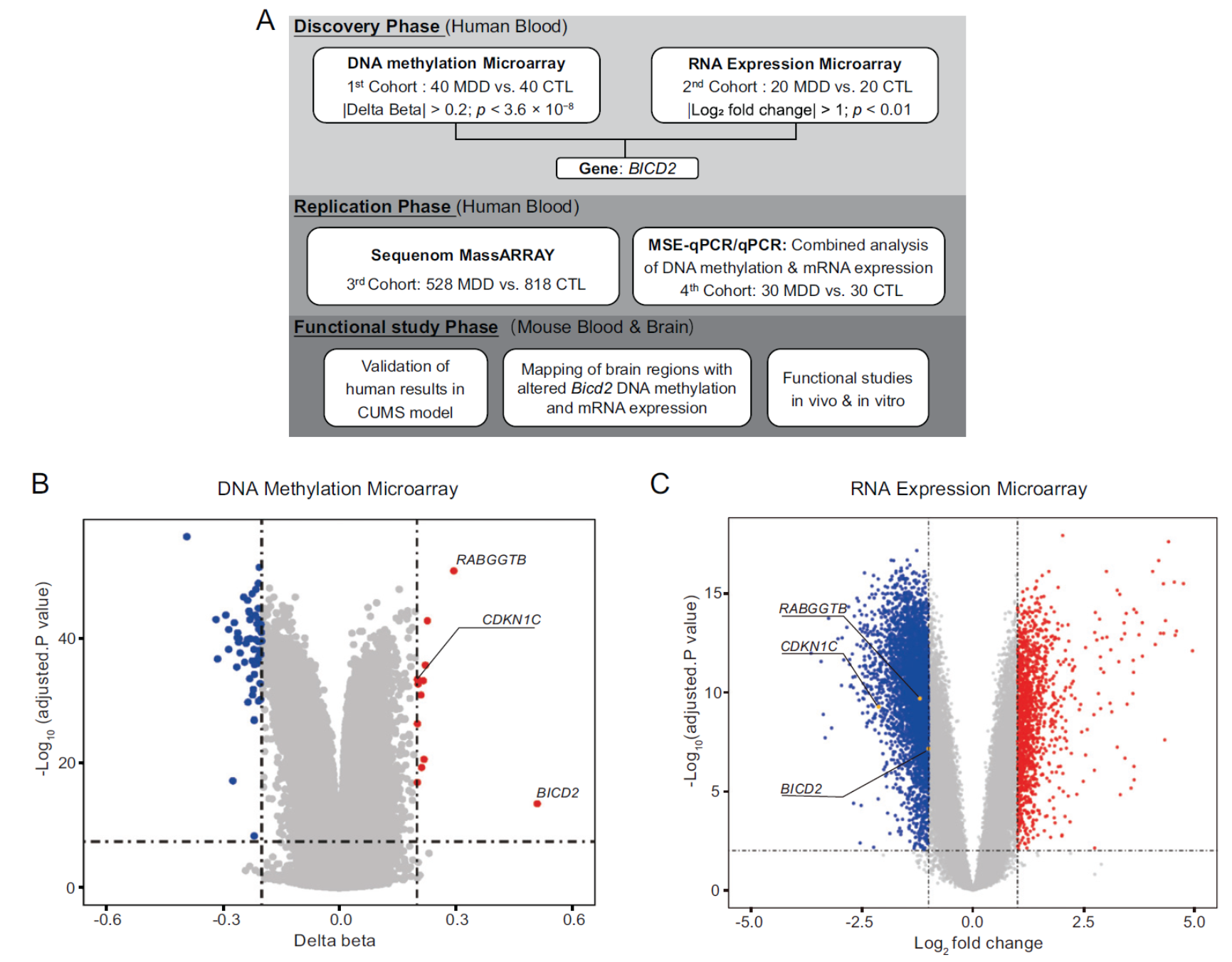 重度抑郁症(major depressive disorder, MDD)是一种常见的精神疾病,给患者、家人及社会带来巨大经济和心理负担。目前MDD的临床诊断很大程度上依赖于访谈和问卷调查,缺乏可靠的生物标志物。DNA甲基化修饰具有稳定和可逆的性质,与复杂疾病的病程和疗效有关,在病因学中起重要作用,同时可作为疾病诊断的生物标志物。本研究(图A)通过整合分析全基因组DNA 甲基化修饰芯片分析(图B)和 RNA 表达谱芯片分析(图C),寻找到目标基因BICD2;在重复验证阶段,采用不同方法通过大样本验证了BICD2 DNA甲基化的变化,并在第四组独立样本中确认BICD2 DNA甲基化水平与mRNA表达水平的相关性;最后,在抑郁模型小鼠中,研究者检测了小鼠外周血和情绪相关脑区的Bicd2 DNA甲基化与mRNA的表达。在压力刺激下,降低小鼠海马区Bicd2的表达起到抗抑郁作用,进一步研究发现降低小鼠海马区Bicd2的表达使得脑源性神经营养因子表达增加,这可能是其起抗抑郁作用的原因。这些结果表明BICD2的DNA甲基化检测可能有助于重度抑郁症的诊断,同时表明BICD2参与抑郁症的发病过程。
