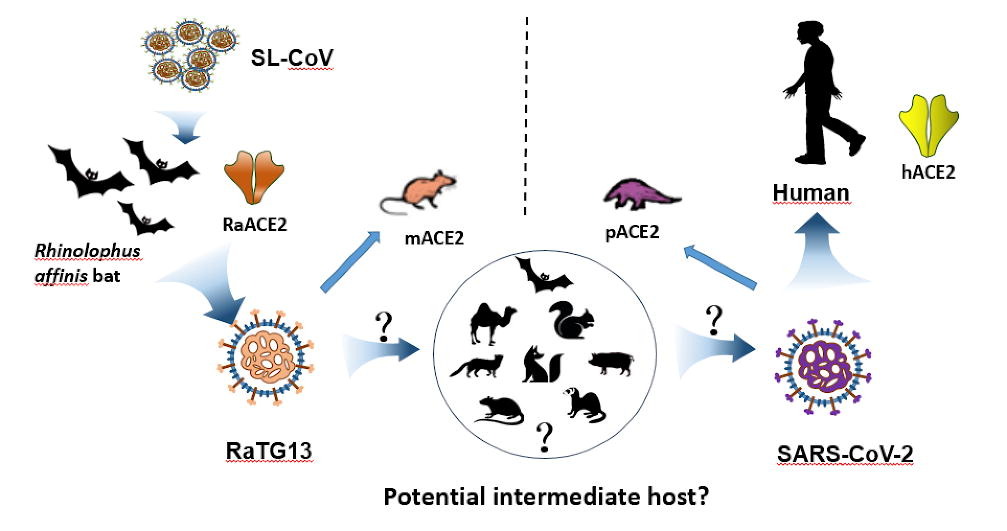 目前,新冠肺炎(COVID-19)仍在全球肆虐,疫情防控形势依然严峻;而摆在科学界面前的不确定问题仍有很多,跨物种传播机制是其中重要的科学问题。新型冠状病毒(SARS-CoV-2)属于β冠状病毒属B亚型冠状病毒,SARS-CoV-2基因组与SARS-CoV和bat SL-CoV RaTG13核苷酸序列的相似性分别为80%和96.2%。SARS-CoV-2与蝙蝠SL-CoVs 的高序列同源性提示SARS-CoV-2可能起源于蝙蝠。然而,蝙蝠病毒由蝙蝠向人类的跨种传播是直接的,还是通过中间动物宿主,仍有待确定。