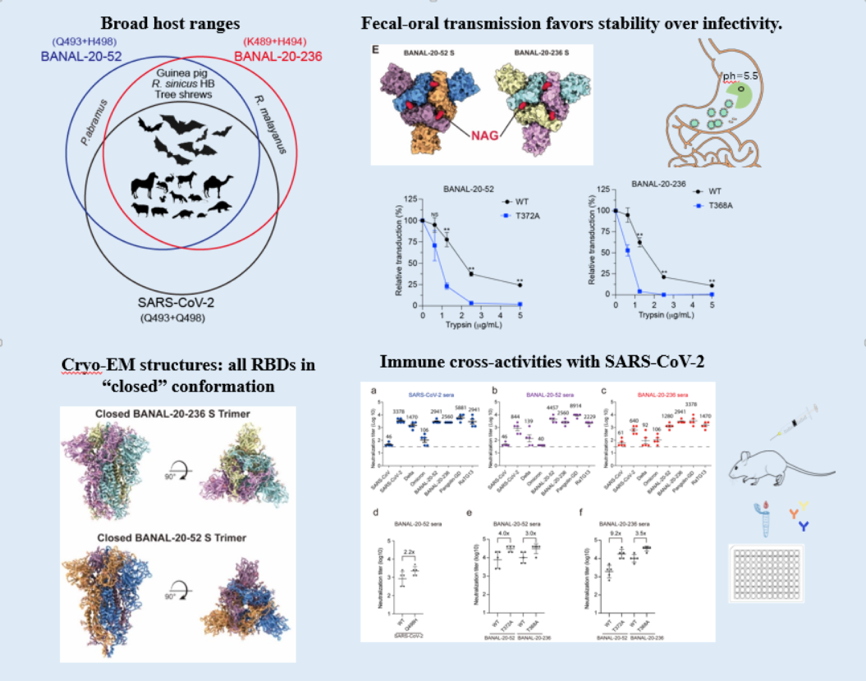 2023年7月28日,beat365英国官方网站病原生物学研究所钱朝晖团队和中国科学院生物物理研究所王祥喜团队合作在Cell Discovery《自然发现》期刊上发表了题为“Host susceptibility and structural and immunological insight of S proteins of two SARS-CoV-2 closely related bat coronaviruses”(两种新冠样蝙蝠冠状病毒S蛋白的宿主易感性、结构以及免疫学研究)的研究论文,对2种于2020年在老挝发现的、与SARS-CoV-2高度同源的蝙蝠冠状病毒BANAL-20-52和BANAL-20-236 S的潜在宿主范围、S蛋白的结构以及免疫特征进行了较系统的研究。