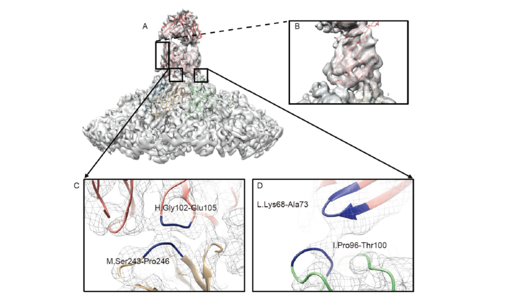 本研究团队通过采集手足口病人的外周血淋巴细胞,提取抗体基因,构建了人源抗EV-A71病毒噬菌体抗体库,并筛选获得了人源抗EV-A71病毒抗体E1。在体外的中和实验和小鼠的体内攻毒实验中,E1展示了良好的中和活性,并在预防和治疗实验中均完全保护了病毒对小鼠的攻击。研究团队通过冷冻电镜技术解析了抗体和病毒的复合物结构,在4.3 Å水平上清晰展示了人源中和抗体E1和EV-A71病毒的结合。E1识别EV-A71病毒VP1蛋白的BC环和HI环中的残基形成的表位,并在受体阻断实验中,显示E1可以阻断EV-A71病毒和受体的结合。进一步阐明了抗体中和病毒的机制,为EV-A71病毒的抗体药物开发奠定了基础。