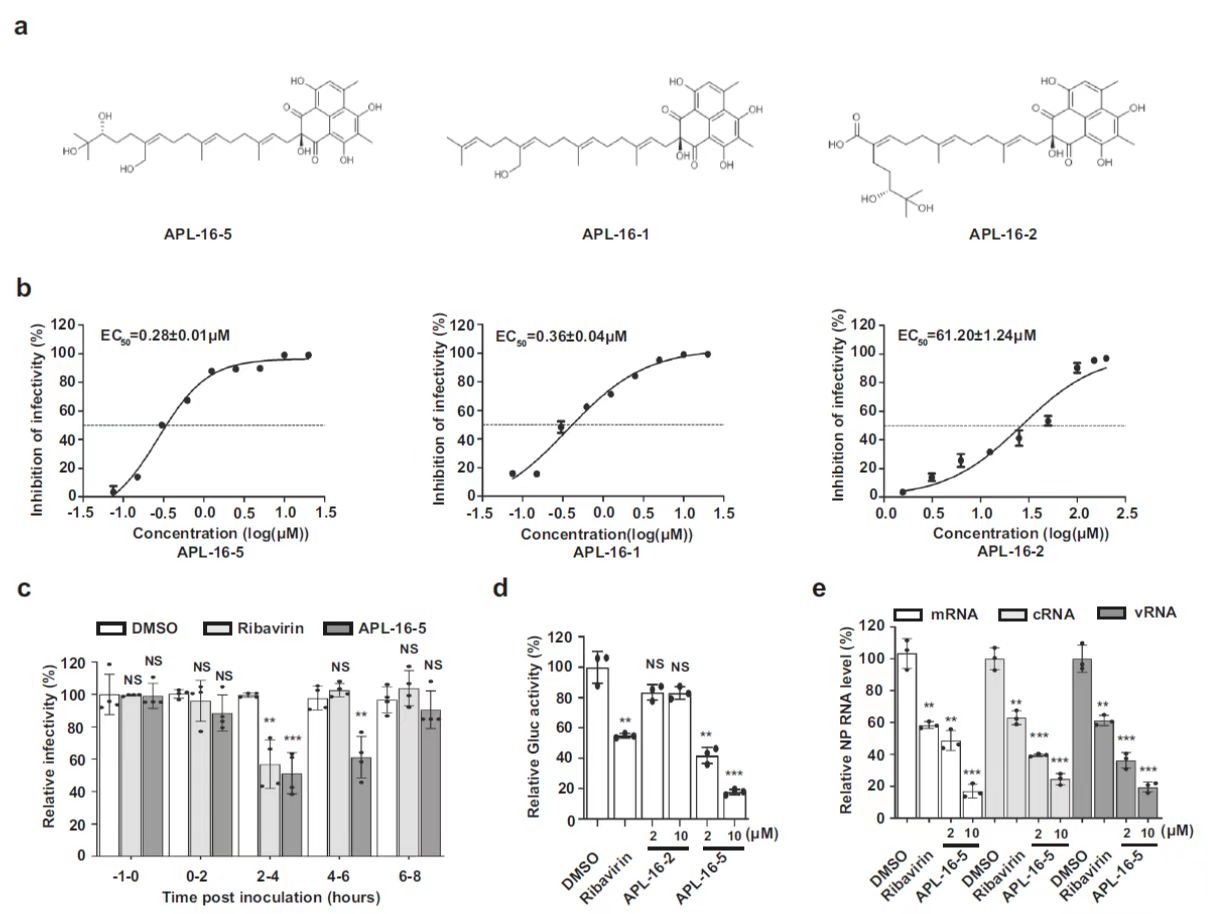 PROTAC技术是目前药物研发领域的热点方向,在克服耐药和靶向不可成药靶点等方面展现出了巨大的潜力。发现新的可利用的E3泛素连接酶并开发相应的PROTAC具有重要科学意义和应用价值。该研究团队发现了第一个来源于微生物天然产物的PROTAC,表明微生物代谢产物可成为其重要来源。微生物天然产物APL-16-5是由国家菌种资源库中国药学微生物菌种保藏管理中心自行分离的植物内生菌Aspergillus sp. CPCC 400735产生。该研究发现APL-16-5同时结合E3泛素连接酶TRIM25和流感病毒PA亚基,基于蛋白降解靶向嵌合体(proteolysis-targeting chimeras,PROTAC)机制,诱导TRIM25依赖的 PA泛素化及其降解,阻断病毒RNA复制,具有良好的体内抗甲型流感病毒活性。