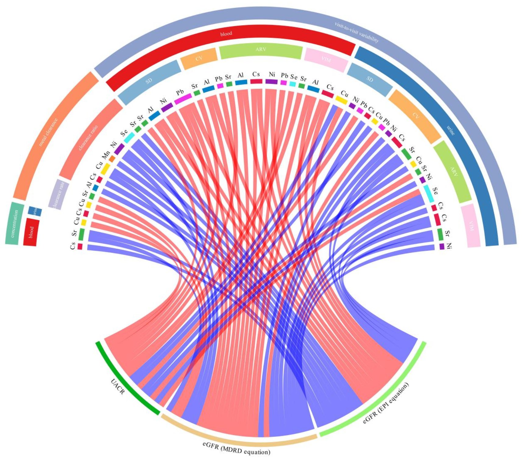 研究结果表明,尿铜与UACR升高呈显著关联。铜、镍、锶的清除比与eGFR呈显著负相关。此外,尿铯和血锶的访次间变异性分别与eGFR降低和UACR升高有关(见图2)。
