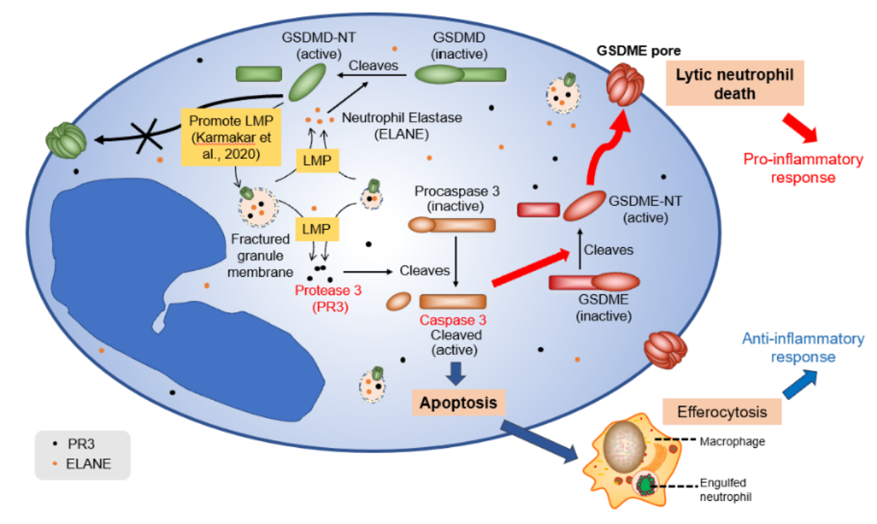 单细胞RNA测序的数据发现小鼠和人中性粒细胞表达一种能将非炎症性凋亡转化为焦亡的孔形成蛋白的前体(GSDME),且GSDME在中性粒细胞死亡过程中存在自发剪切。该研究构建GSDME基因敲除小鼠,分离小鼠的骨髓和腹腔中性粒细胞,发现基因敲除小鼠的中性粒细胞焦亡消失,凋亡明显增多,因此GSDME决定中性粒细胞的死亡方式。此外,还发现GSDMD基因敲除不能改变中性粒细胞的死亡方式,但可以延缓中性粒细胞的死亡。在小鼠腹膜炎和肺炎模型,GSDME基因敲除的中性粒细胞死亡后以凋亡为主,更易发生胞葬,炎症消退加快。在无菌及有菌的肺炎模型,GSDME基因全部敲除以及中性粒细胞中条件性敲除GSDME的小鼠炎症反应和组织损伤减弱。该研究首次证明GSDME调控中性粒细胞凋亡和焦亡的平衡从而改变细胞在体内的清除方式(胞葬),进而影响炎症的进展和组织损伤。因此,调控中性粒细胞的死亡方式,使细胞死亡以凋亡为主,减少焦亡,可能有助于炎症的消退和缓解组织损伤。