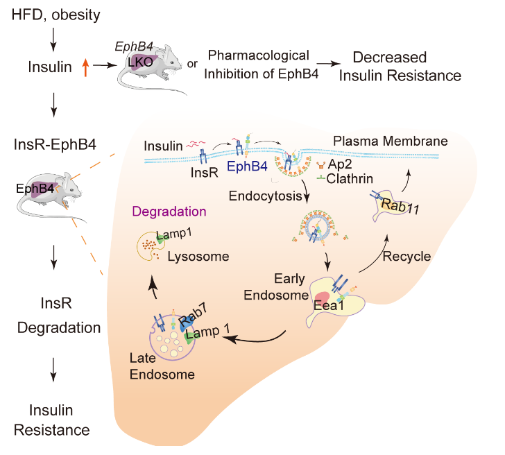 本研究团队首次发现EphB4能够直接与胰岛素受体(InsR)形成相互作用;生理和病理浓度的胰岛素均增加EphB4与InsR 的相互作用;在肝细胞中,EphB4 通过其Ap2 结合位点进而介导胰岛素受体内吞并经溶酶体途径降解;在小鼠肝组织中,敲除EphB4能够有效改善饮食诱导或遗传因素导致的肥胖小鼠模型的胰岛素抵抗状态;在糖尿病模型 db/db小鼠中,慢病毒shRNA敲低EphB4或给予EphB4抑制剂均明显增强动物的胰岛素敏感性,改善肥胖小鼠的葡萄糖稳态。本研究揭示了胰岛素促进胰岛素受体降解这一生物学过程的新机制,亦为胰岛素抵抗和2型糖尿病的治疗提供潜在新药靶。