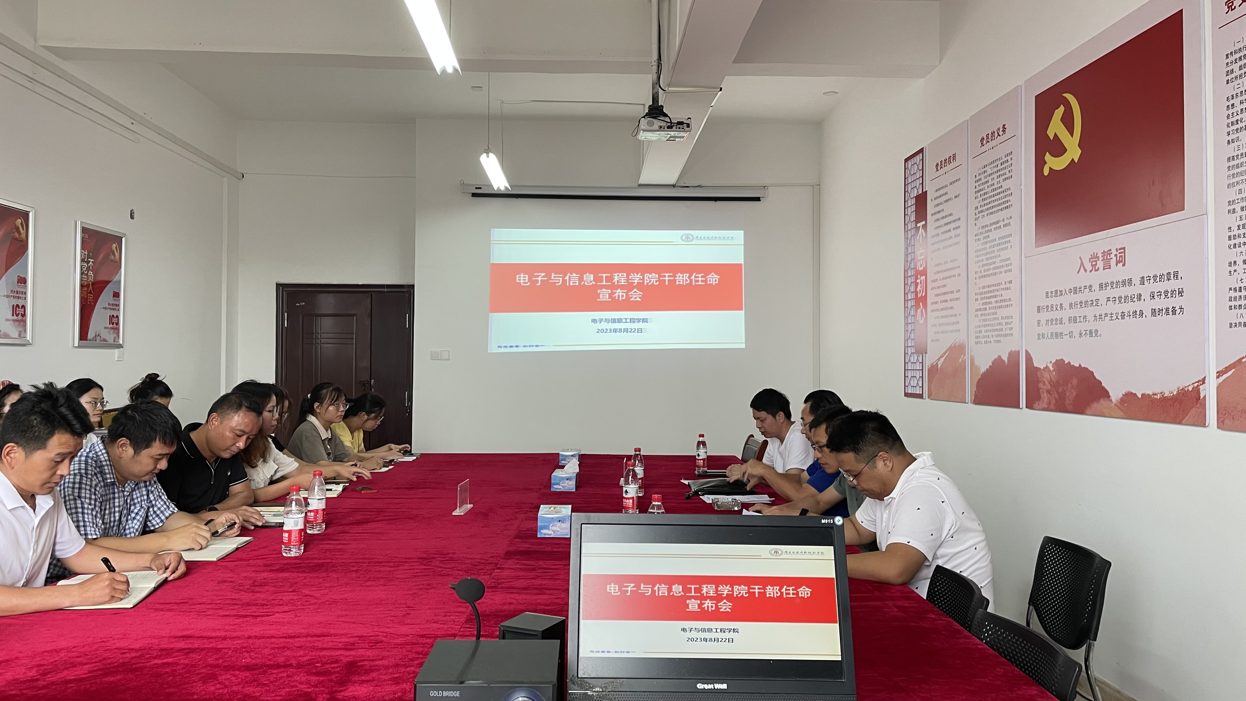 8月22日,电子与信息工程学院干部任命宣布会在学院会议室1407举行。校长助理李少义、校长助理黄国清、人事处处长、党委组织部部长杨冬、教务处处长翁凌霄出席会议,电子与信息工程学院领导班子、辅导员及教师代表参加会议,会议由翁凌霄主持。
