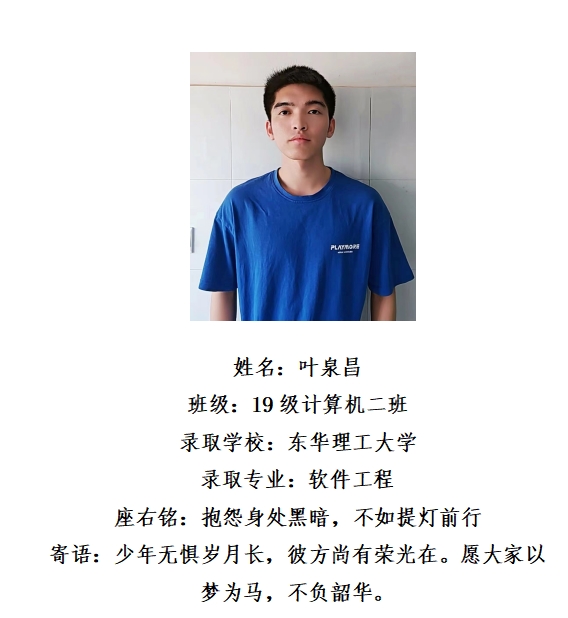 先进典型 优秀毕业生 优秀学生风采 优秀教职工 您现在的位置是:首页 > 先进典型 > 优秀毕业生 叶泉昌 管理员2023-09-011742 上一篇 王涛 下一篇 青春榜样力量||优秀毕业生——华文新