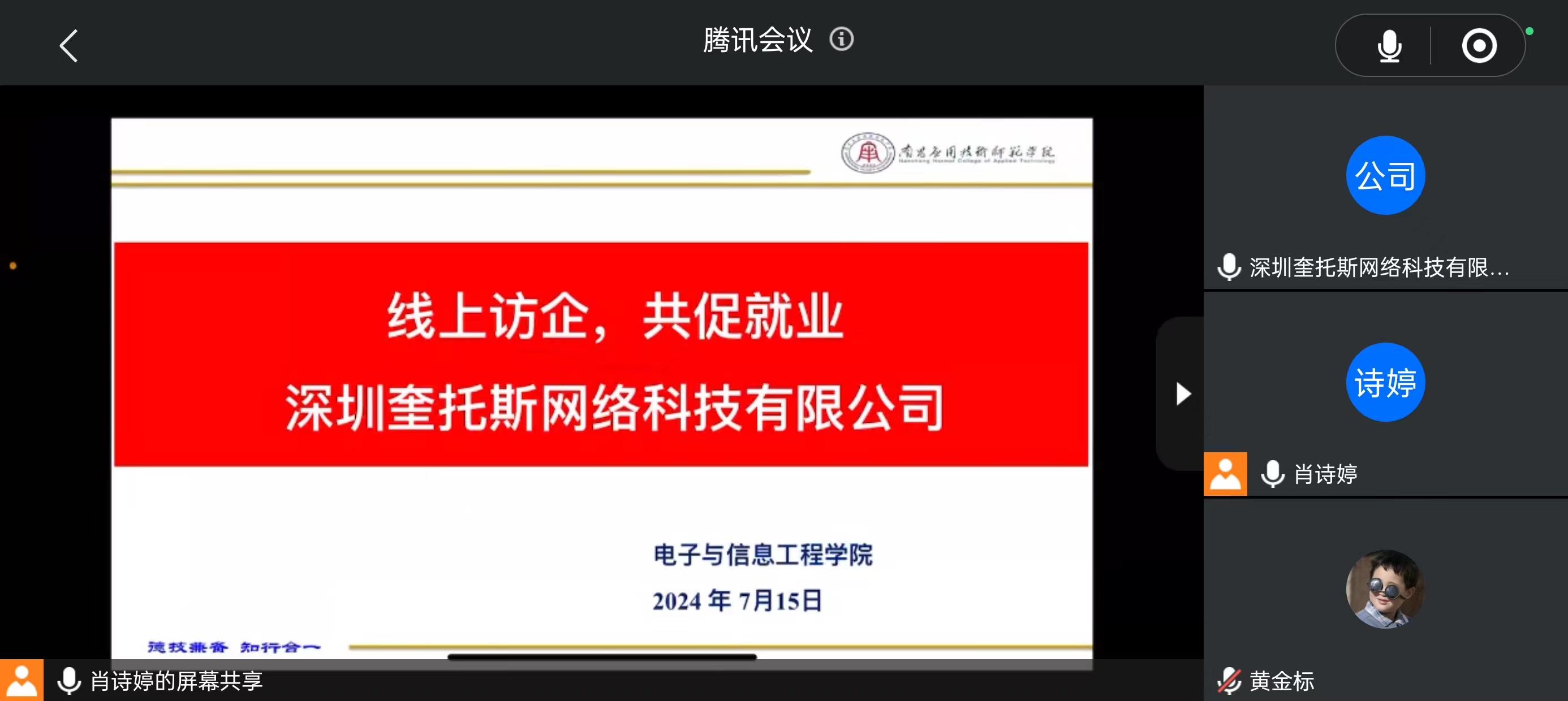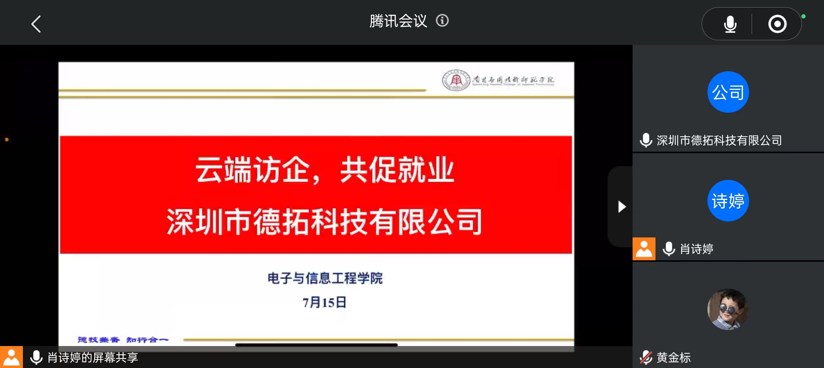 为统筹推进毕业生就业工作,积极助力毕业生更充分更高质量就业。7月15日,beat365中文登录入口党总支副书记黄金标和辅导员肖诗婷与深圳奎托斯网络科技有限公司和深圳市德拓科技有限公司进行线上访企拓岗。