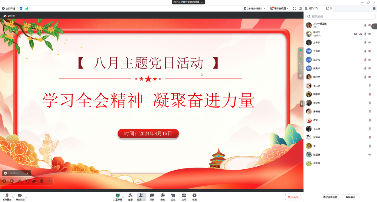 为深入学习贯彻党的二十届三中全会精神,感悟革命历史,强化爱国情怀和使命感,激励党员同志勇毅前行,争当先锋,beat365中文登录入口第二党支部于8月15日召开线上会议,开展了“学习全会精神 凝聚奋进力量”主题党日活动。