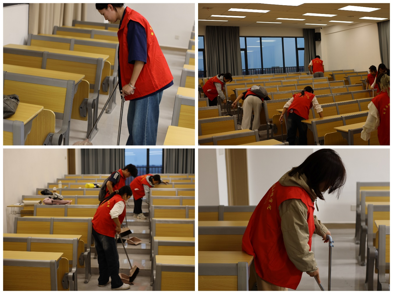 活动期间,志愿者们身穿红马甲,手持扫把、拖把、抹布等工具,对教学楼内的垃圾桶、地面、走廊两侧的垃圾进行了彻底清理,确保了清洁工作的全面性和无死角。他们不仅传递了自觉维护环境卫生的责任感和意识,也展现出青年学子不怕苦、不怕累、不怕脏的精神风貌。