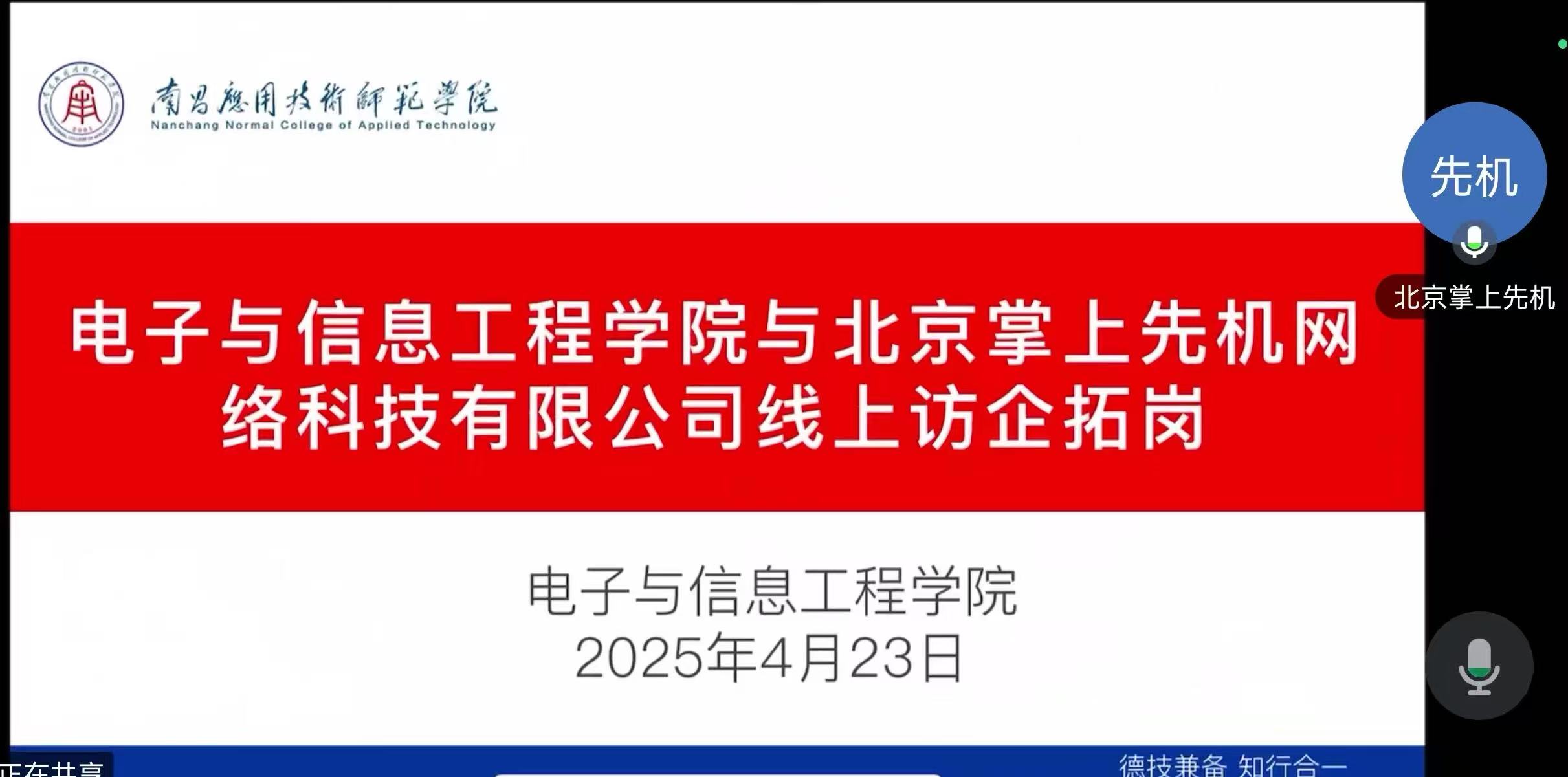 为贯彻落实党中央、国务院关于“稳就业”、“促就业”工作部署,按照教育部、省教育厅关于“访企拓岗”促就业专项行动工作要求,深入了解企业需求、挖掘实习就业岗位,全力促进毕业生更高质量就业,beat365中文登录入口积极开展访企拓岗专项行动,院长魏艳平于4月23日通过线上视频会议与北京掌上先机网络科技有限公司、赣州市义超电子有限公司、江西引力节拍文化传媒有限公司、浙江京鸿供应链管理有限公司进行洽谈。