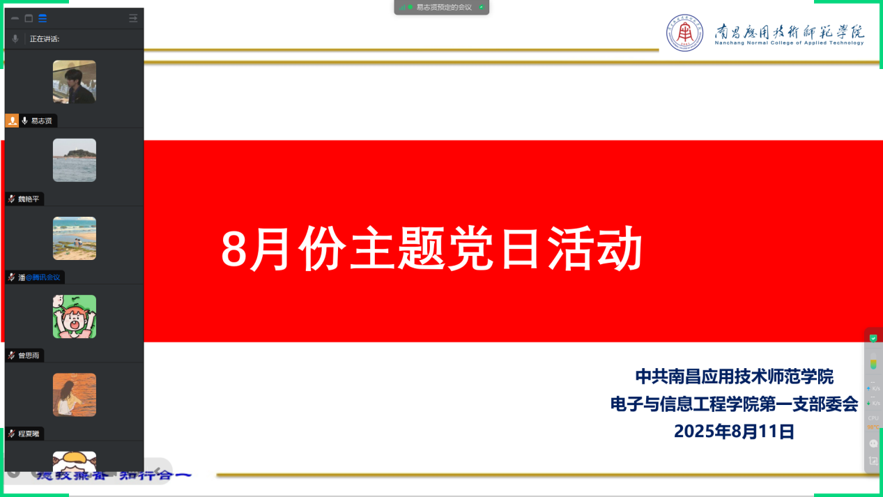 为纪念八一南昌起义98周年,教育引导全院党员传承红色基因,赓续红色血脉。beat365中文登录入口第一支部于8月11号开展8月份主题党日活动“赓续红色血脉 擦亮英雄城底色”。此次活动由党支部书记魏艳平主持,全体党员参加。