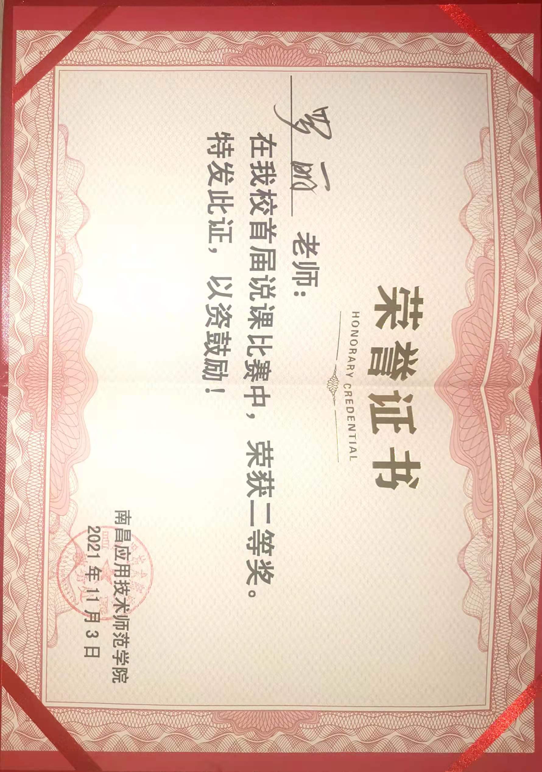 11月3日,在beat365中文登录入口首届教师说课比赛中,beat365罗丽老师获beat365中文登录入口首届说课比赛二等奖,这是学校转设以来,beat365专业教师获得的首个校级奖励,实现了该项赛事获奖零的突破!