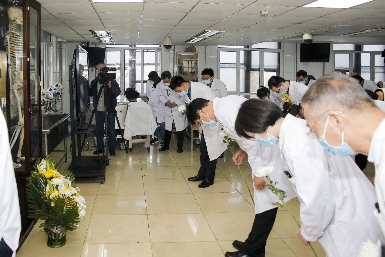 开课仪式是我校人体解剖教学的老传统之一。仪式上,校领导和学院领导为学生们颁发了医学生的标志——白大衣。师生们现场为大体老师敬献鲜花,藉此来对他们为医学教育发展以身相许的奉献精神表达崇高敬意。