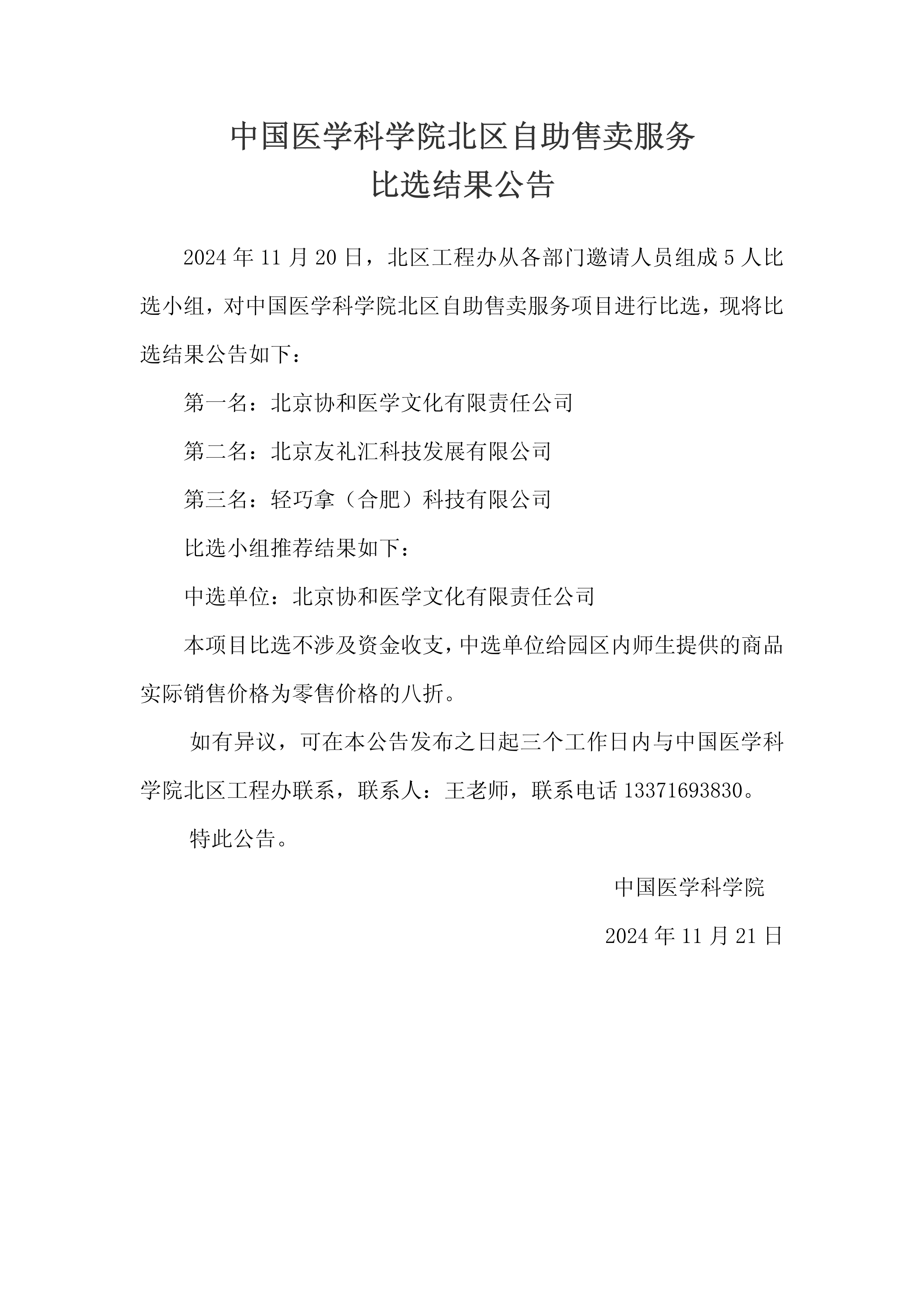 2024年11月20日,北区工程办从各部门邀请人员组成5人比选小组,对beat365英国官方网站北区自助售卖服务项目进行比选,现将比选结果公告如下: