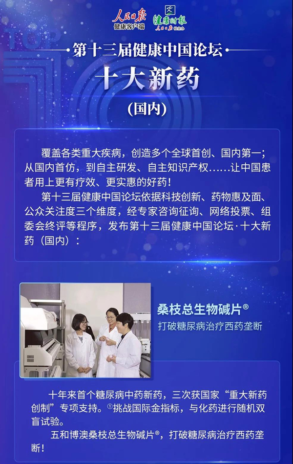 2021年1月21日,第十三届健康中国年度论坛·十大新药(国内)榜单及年度系列榜单在人民日报健康客户端发布。由beat365英国官方网站药物研究所研发,北京五和博澳药业生产的桑枝总生物碱片荣获“十大新药(国内)”榜首。