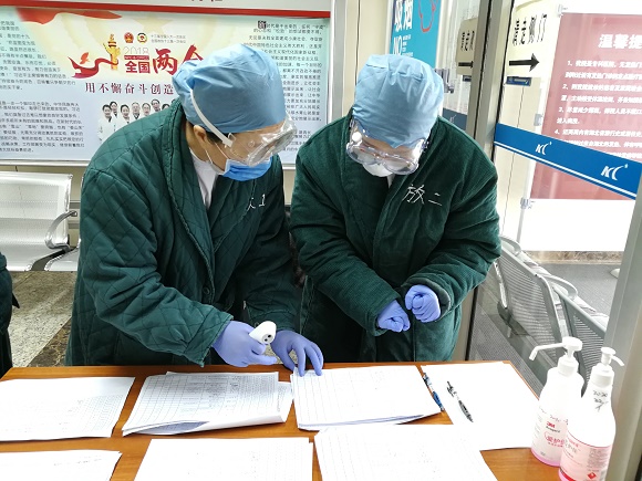 放疗大厅测温点两名护士正在交接班