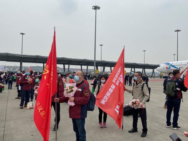 4月7日下午,输血所6名逆行勇士随四川省最后一批援湖北医疗队凯旋。四川省委省政府在双流机场举行隆重的欢迎仪式。省委书记彭清华到机场迎接并讲话,省委副书记、省长尹力主持欢迎仪式,省卫生健康委党组书记沈骥、主任何延政和输血所党委书记陈勇军等参加了欢迎仪式。