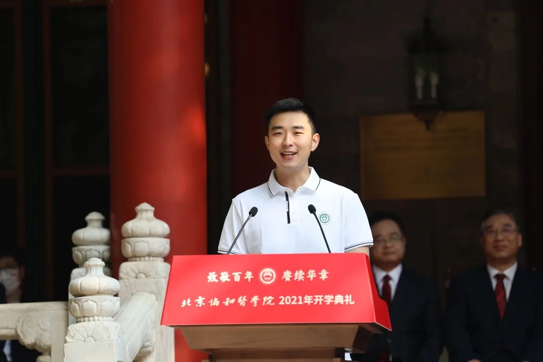 新生代表2021级直博生袁硕发言,号召全体新生作为协和精神的传承人,将个人医学梦融入到国家医学发展的大潮中去,以“除人类之病痛,助健康之完美”为己任,为社会医药卫生事业的发展和人类身心健康奋斗终身,不负祖国和人民的殷切期望。