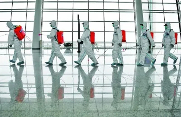 4月3日,湖北省武汉市消防救援支队消杀队员对天河国际机场T3航站楼进行封闭式卫生防疫消杀工作。新华社发