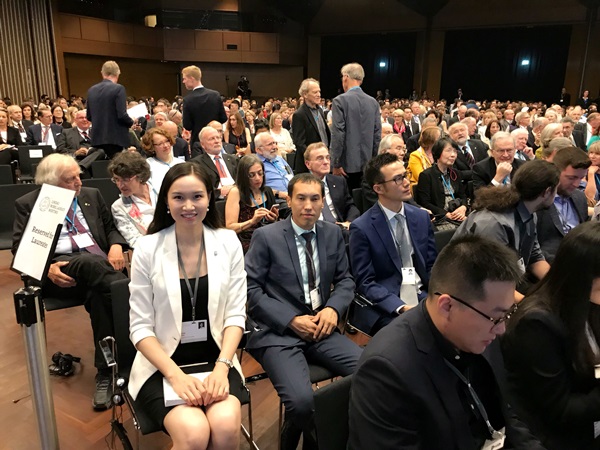 我校博士生刘洋在大会现场,身后为参会的43位诺奖获得者以及来自全球的青年科学家