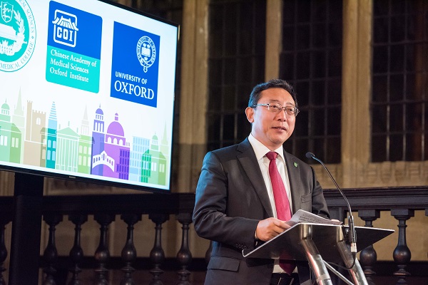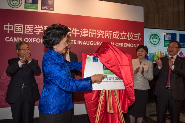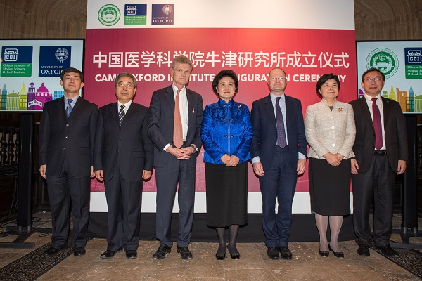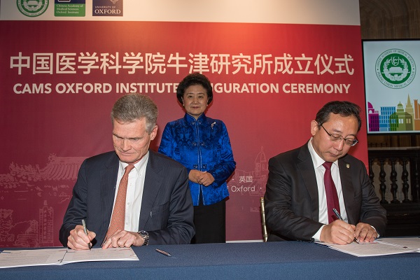 beat365英国官方网站牛津研究所(CAMS Oxford Institute)合作协议签字和揭牌仪式2017年12月6日下午在英国牛津大学举行。国务院副总理刘延东、国务院副秘书长江小涓、教育部部长陈宝生、科技部党组书记王志刚、国家卫生计生委副主任崔丽、驻英国使馆大使刘晓明以及参加第五次中英高级别人文交流代表团成员,国家卫生计生委参加第三届中英卫生政策对话有关代表,牛津大学常务副校长罗伯特·伊斯顿(Robert Easton),前英国医学科学院院长、牛津大学钦定医学主席(Regius Chair of Medicine)约翰·贝尔爵士等英方领导及科研人员和留学生代表,院校曹雪涛院校长、郑忠伟副院校长、张学副院校长以及有关部门负责人、部分所院负责人和科研人员代表等共100余人参加仪式。郑忠伟副院校长主持了签约和揭牌仪式。