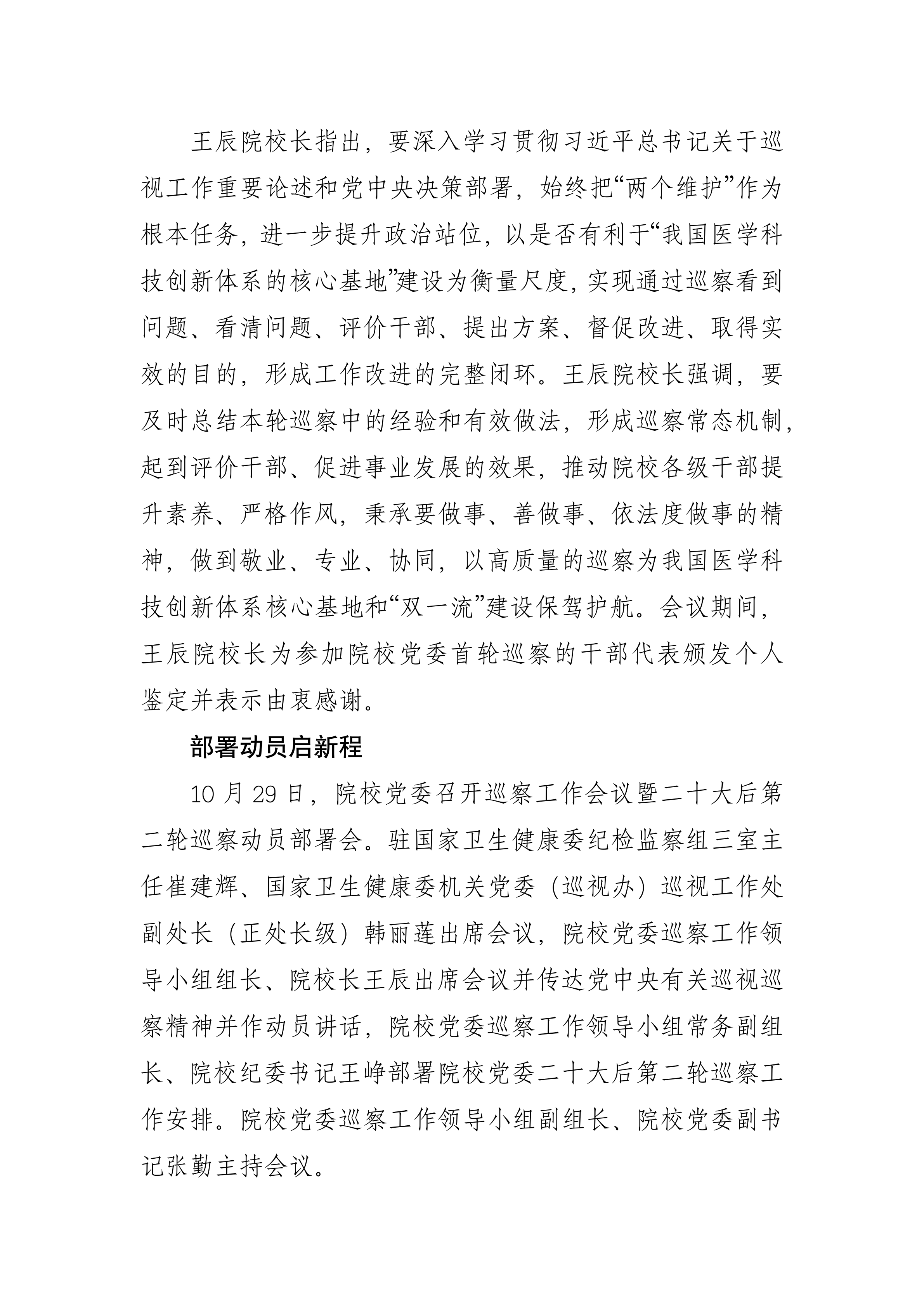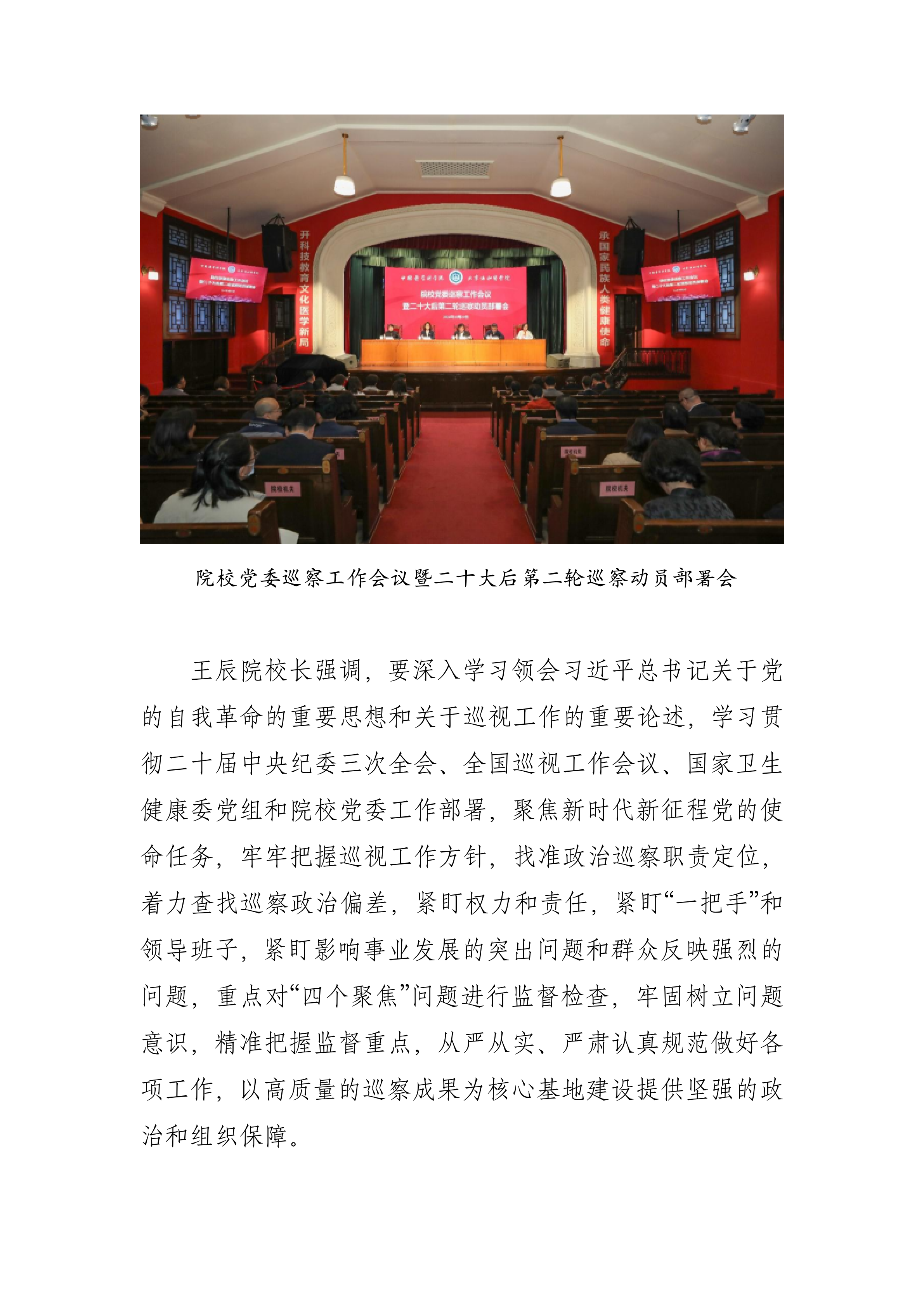 王辰院校长强调,要深入学习领会习近平总书记关于党的自我革命的重要思想和关于巡视工作的重要论述,学习贯彻二十届中央纪委三次全会、全国巡视工作会议、国家卫生健康委党组和院校党委工作部署,聚焦新时代新征程党的使命任务,牢牢把握巡视工作方针,找准政治巡察职责定位,着力查找巡察政治偏差,紧盯权力和责任,紧盯“一把手”和领导班子,紧盯影响事业发展的突出问题和群众反映强烈的问题,重点对“四个聚焦”问题进行监督检查,牢固树立问题意识,精准把握监督重点,从严从实、严肃认真规范做好各项工作,以高质量的巡察成果为核心基地建设提供坚强的政治和组织保障。