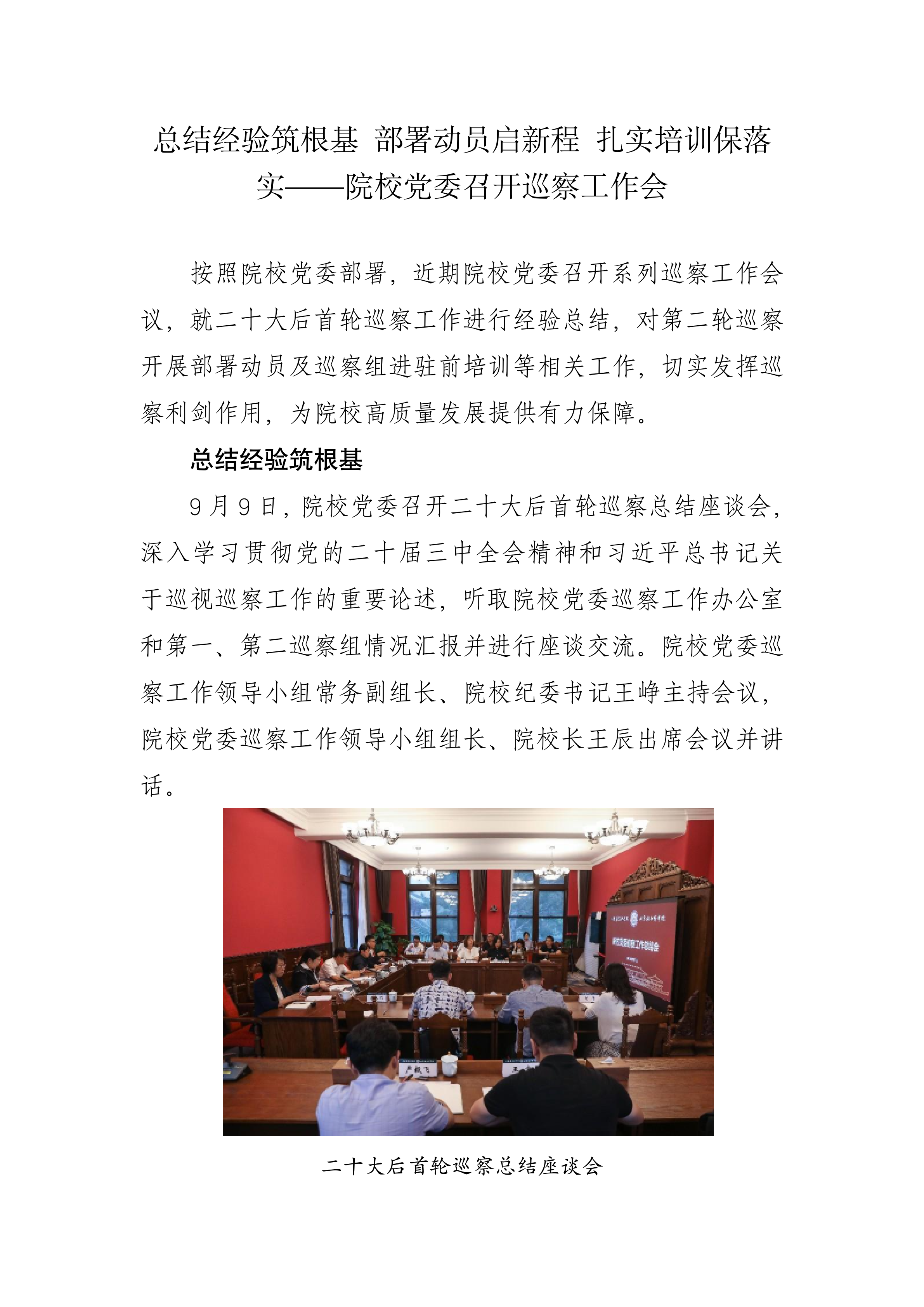 按照院校党委部署,近期院校党委召开系列巡察工作会议,就二十大后首轮巡察工作进行经验总结,对第二轮巡察开展部署动员及巡察组进驻前培训等相关工作,切实发挥巡察利剑作用,为院校高质量发展提供有力保障。