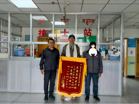 林周县人民检察院党组书记、检察长索朗晋美(左)、周栩医生(中)和患者家属(右)在林周县人民医院合影