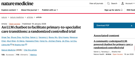 Tao, X., Zhou, S., Ding, K. et al. An LLM chatbot to facilitate primary-to-specialist care transitions: a randomized controlled trial. Nat Med (2026). https://doi.org/10.1038/s41591-025-04176-7